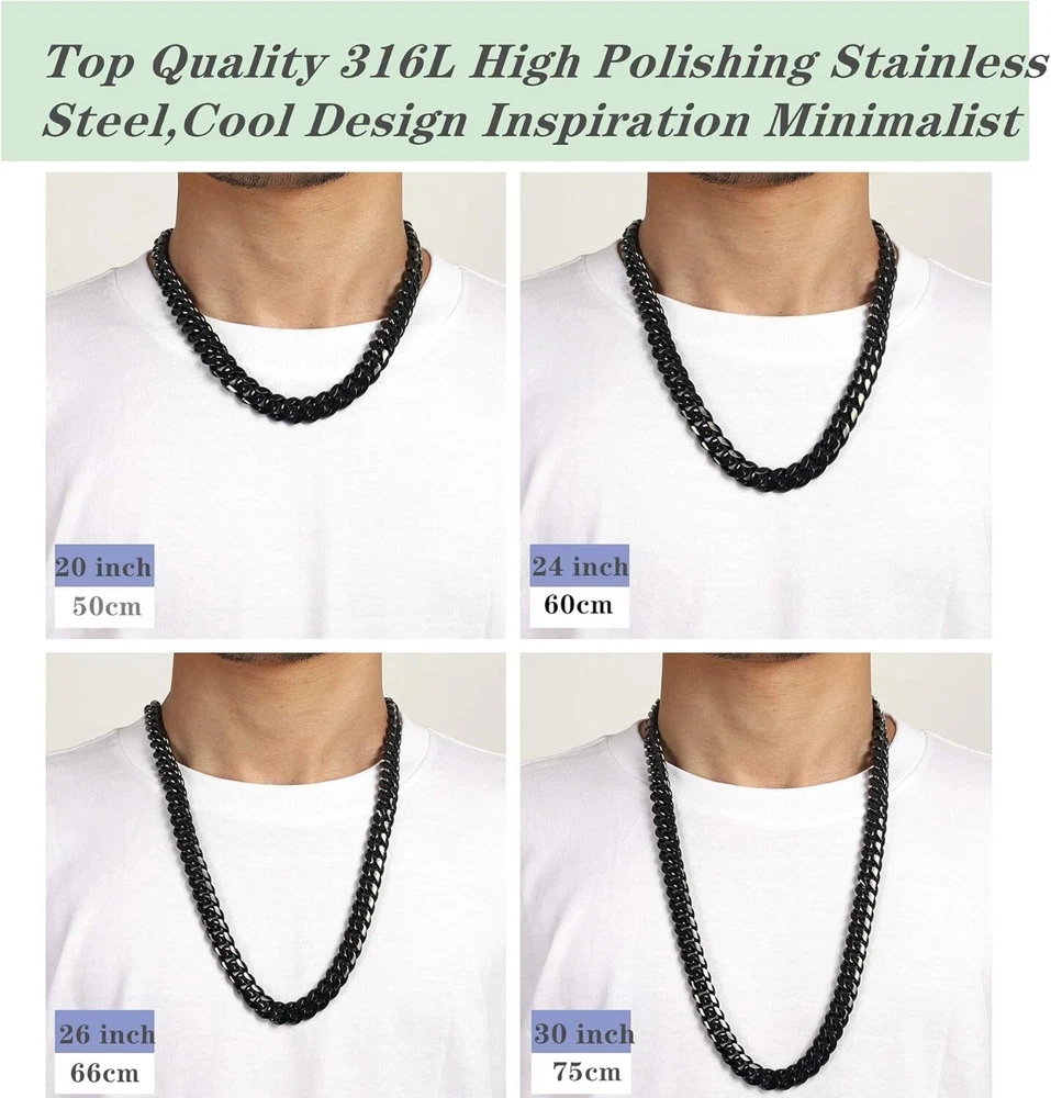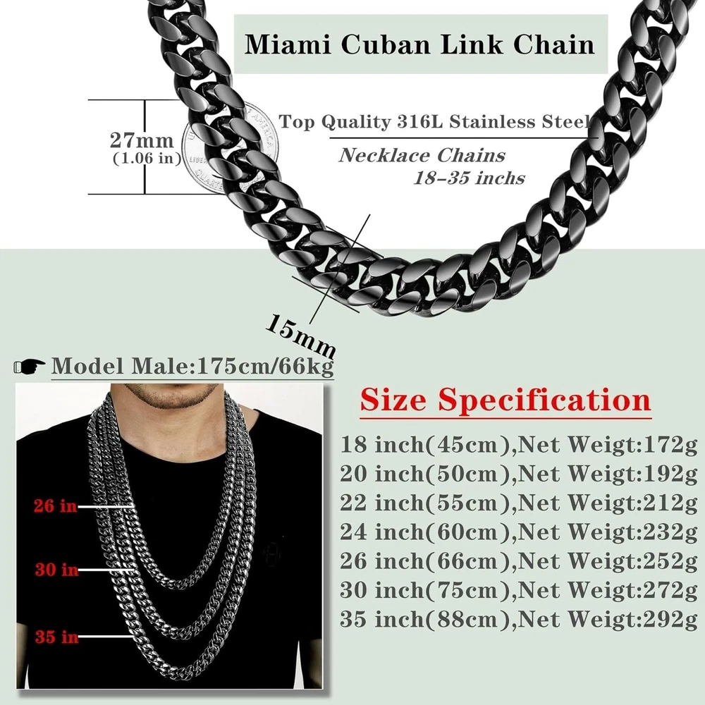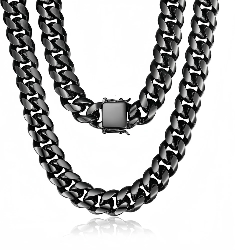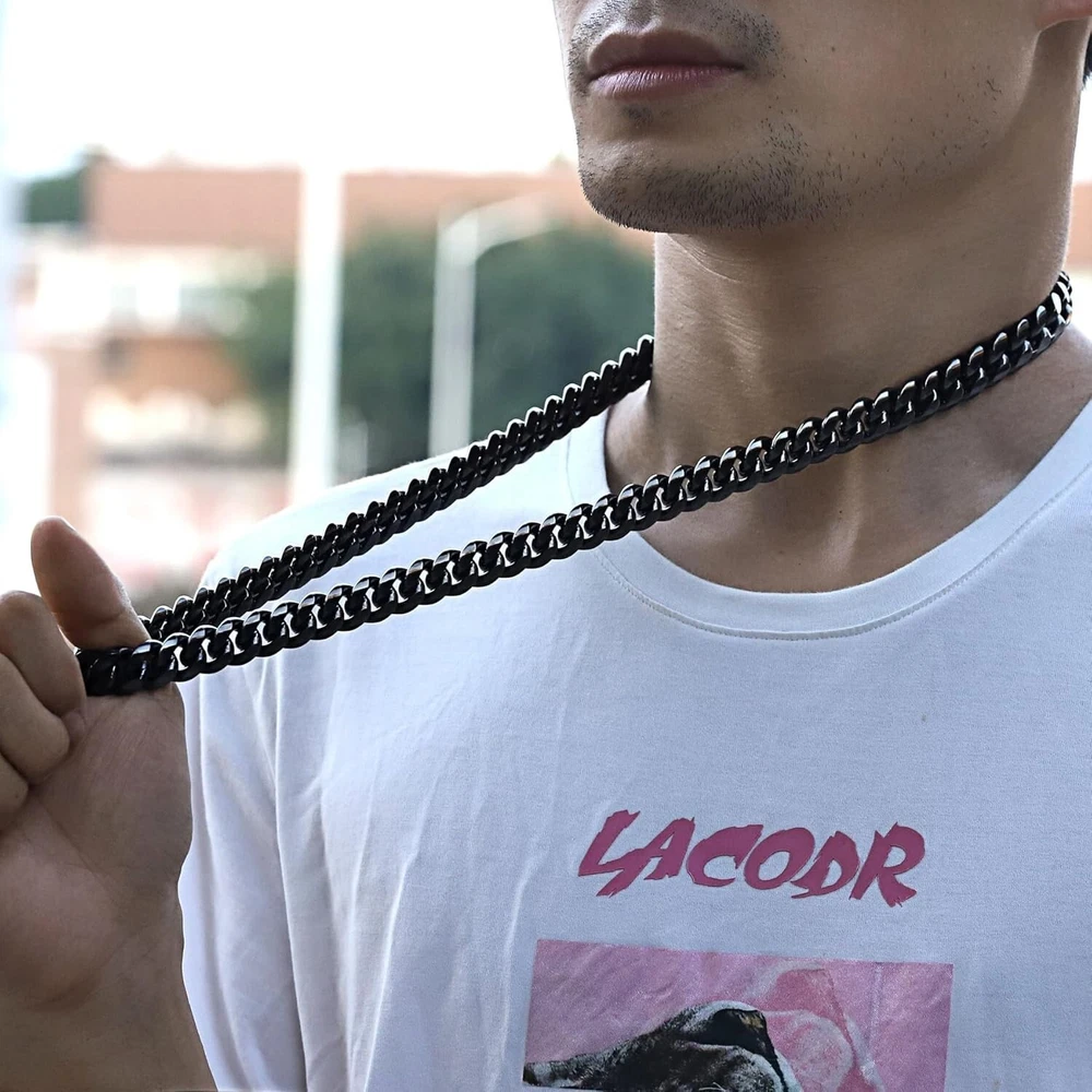 Metal Purity: Unknown Handmade: No Main Stone Shape: Unknown Chain Type: Cuban Main Stone Color: No Stone Number of Diamonds: 0 Style: Chain, Cuban Link, Miami Cuban Link, Hip Hop Jewelry Antique: No Closure: Box Occasion: Birthday, Father's Day, Anniversary, Valentine's Day, Prom, Christmas Base Metal: Stainless Steel Gemstone Clarity Grade: Unknown gtin13: Does not apply Main Stone: No Stone Setting Style: Box Type: Necklace Cut Grade: Unknown Department: Unisex Adults Secondary Stone: No Stone UPC: Does not apply Item Display Length: 30 Inches Pendant Shape: Unknown Main Stone Treatment: Not Enhanced Signed: No Color: Black Material: Metal, 316L Stainless Steel, Titanium, Black Plated Number of Gemstones: 0 Diamond Color Grade: N Metal: Stainless Steel Diamond Clarity Grade: Unknown Pendant/Locket Type: None Customized: No Total Carat Weight: 0.00 Main Stone Creation: Unknown Brand: Unbranded Wholesale: No Colored Diamond Intensity: Unknown Personalize: No Features: Adjustable, Heavy, Durable, Classic, Stylish