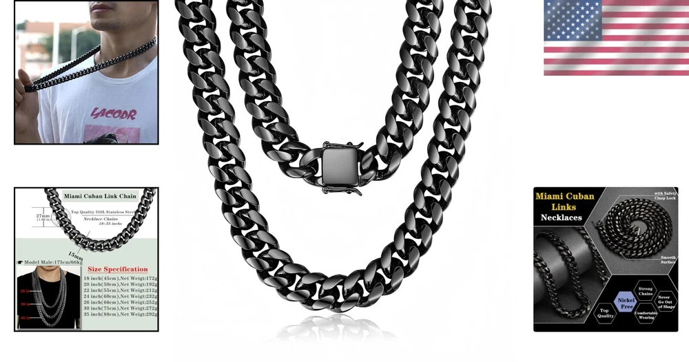Elegant Black Miami Cuban Link Chain Necklace - 15mm Width, Gift Box Included ‹ › ‹ › ‹ › ‹ › ‹ › ‹ › ‹ › ‹ › ‹ › ‹ › ‹ › Elegant Black Miami Cuban Link Chain Necklace Width: 15mm | Length: 30 inches | Material: High-Quality Titanium and Stainless Steel | Clasp Type: Box Clasp Features: Crafted from premium 316L stainless steel for durability Double-lock clasp for security and ease of wear Black plated with a high-quality finish using 5 times PVD plating for an everlasting shine Classic Miami Cuban Link design, synonymous with luxury and style Weight varies by size: 18" (182g), 20" (199g), 22" (220g), 24" (243g), 26" (262g), 30" (306g), up to 35" (362g) Presented in a beautiful gift box, making it an exquisite present for any occasion Benefits: Unmatched elegance for your wardrobe, perfect for any occasion, from casual to formal Heavily constructed for long-lasting wear, ensuring this chain becomes a staple in your collection Eye-catching design enhances your style and makes a bold statement wherever you go Ideal gift for birthdays, Father’s Day, anniversaries, Valentine's Day, prom, and Christmas Your satisfaction is paramount, supported by dedicated customer service Why Choose Our Black Miami Cuban Link Chain Necklace? Elevate your accessory game with the striking elegance of our Black Miami Cuban Link Chain Necklace. This piece is not just jewelry; it’s a statement of style and sophistication. The meticulous design combined with high-quality materials ensures that you not only look good but feel great wearing it. Whether you’re heading to a party, a special event, or simply want to enhance your everyday look, this necklace is the perfect choice. Treat yourself or surprise a loved one with a gift that embodies quintessence and luxury. Order yours today and make a statement that lasts a lifetime! Shipping Free & Fast Shipping - We offer free shipping to most of the USA with a normal delivery time of 3-7 days. However, due to the current situation, additional delivery time (up to 3 weeks) may be required for some items. Alternative Carriers - We may use alternative carriers (e.g. USPS, FedEx, UPS, etc.) to ensure your package arrives safely and on time. Due to the use of multiple carriers, we are unable to provide a tracking number automatically. Handling Time - Orders are processed and shipped within 1-2 business days of receiving cleared payment. Shipping Restrictions - Shipping to Alaska, Hawaii, Puerto Rico, Guam, and other US territories may incur shipping charges or delivery restrictions. Please contact us before ordering, or your order can be refunded/cancelled. State Restrictions - There may be restrictions based on your state of purchase. For example, certain items may not be shipped to California due to state regulations. Contact for Tracking Updates - If you require tracking updates or have any concerns about the delivery of your order, please feel free to contact us, and we will be happy to assist you. Return Please see our eBay Return Policy. Thank you. Payment We accept all major credit cards, PayPal, and Apple Pay for your convenience. Your payment information is secure and encrypted to ensure a safe and seamless transaction. Please complete your payment within 3 days of purchase to avoid any delays in shipping. Feedback Your feedback is extremely important to us. We strive to provide the best products and customer service possible. If you are satisfied with your purchase, please take a moment to leave us a positive review. If you have any concerns or issues with your order, please contact us before leaving negative feedback. We are committed to resolving any problems and ensuring your satisfaction. Contact Us If you have any questions or concerns, please feel free to reach out to our customer support team. You can contact us through the eBay messaging system. We are available Monday to Friday, 9:00 am to 5:00 pm EST, and we will do our best to respond to your inquiry within 24 hours. Thank you for supporting our small family business! UPC: Not Set Metal Purity: Unknown Total Carat Weight: 0.00 Unit Quantity: 30 Style: Chain,Cuban Link,Miami Cuban Link,Hip Hop Jewelry Material: Metal,316L Stainless Steel,Titanium,Black Plated Main Stone Treatment: Not Enhanced Certification: Not Set Secondary Stone: No Stone Theme: Not Set Features: Adjustable,Heavy,Durable,Classic,Stylish Occasion: Anniversary,Birthday,Christmas,Father's Day,Valentine's Day,Prom Type: Necklace Brand: Unbranded Color: Black Main Stone Color: No Stone Metal: Stainless Steel Main Stone: No Stone Diamond Color Grade: N Necklace Length: Not Set Main Stone Shape: Unknown Country of Origin: Not Set Setting Style: Box Main Stone Creation: Unknown Cut Grade: Unknown Colored Diamond Intensity: Unknown Diamond Clarity Grade: Unknown Base Metal: Stainless Steel Chain Type: Cuban Number of Diamonds: 0 Number of Gemstones: 0 Pendant Shape: Unknown Pendant/Locket Type: None Country/Region of Manufacture: Not Set Closure: Box Gemstone Clarity Grade: Unknown MPN: Not Set Unit Type: Not Set Department: Not Set Wholesale: Not Set Signed: Not Set Handmade: Not Set Antique: Not Set Personalize: Not Set Customized: Not Set