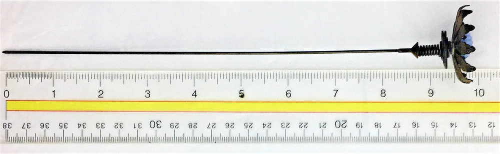 This product is a stunning blue cornflower glass and brass trembler hatpin, handmade with intricate details. The hatpin is a unique and collectible item, perfect for adding a touch of elegance to any hatted outfit. The beautiful combination of the lovely blue glass and the brass accents make it a standout piece for any hat or accessory collection. Ideal for those who appreciate artisan craftsmanship and vintage design.