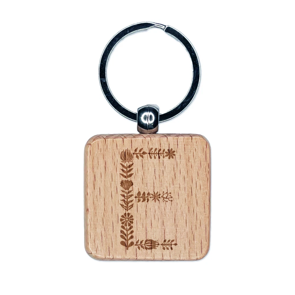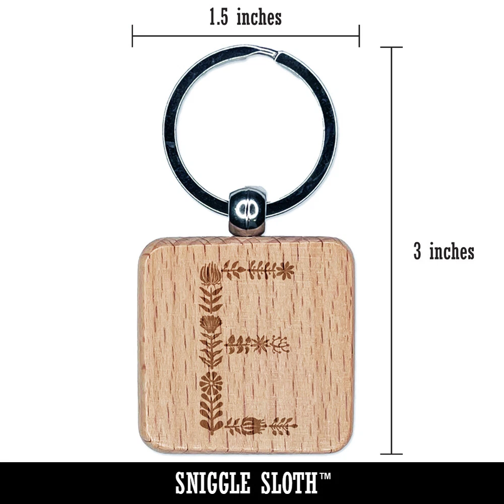 Elegant Botanical Floral Letter E Engraved Wood Square Keychain Tag Charm