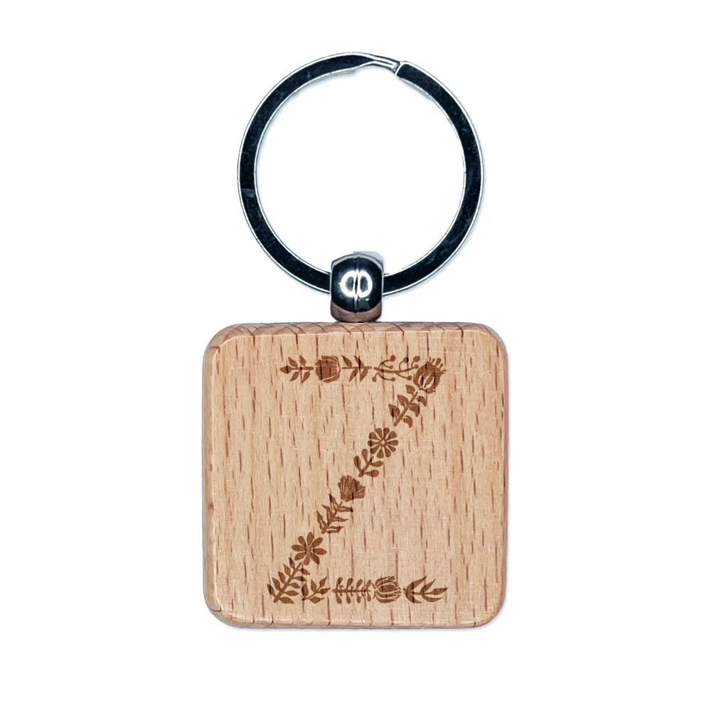 Elegant Botanical Floral Letter Z Engraved Wood Square Keychain Tag Charm