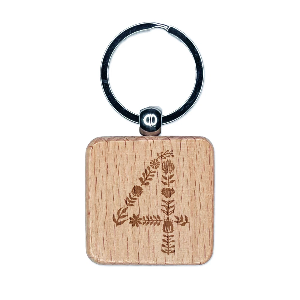 Elegant Botanical Floral Number 4 Engraved Wood Square Keychain Tag Charm
