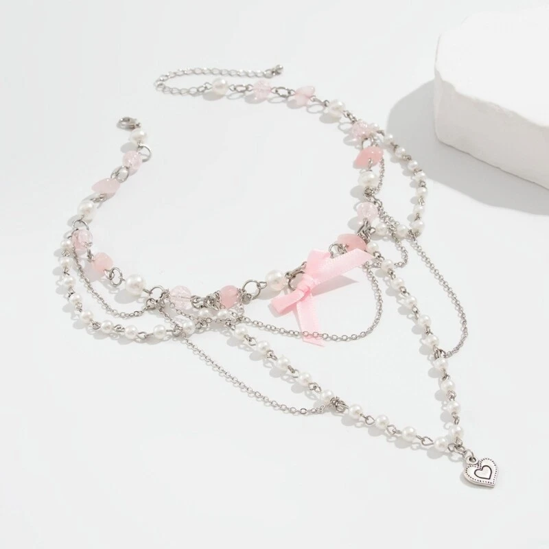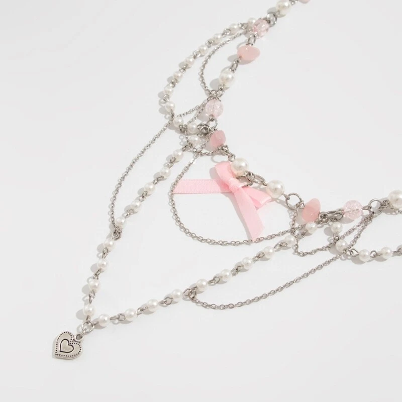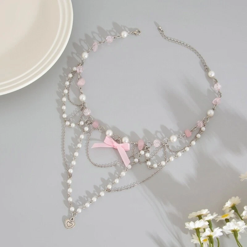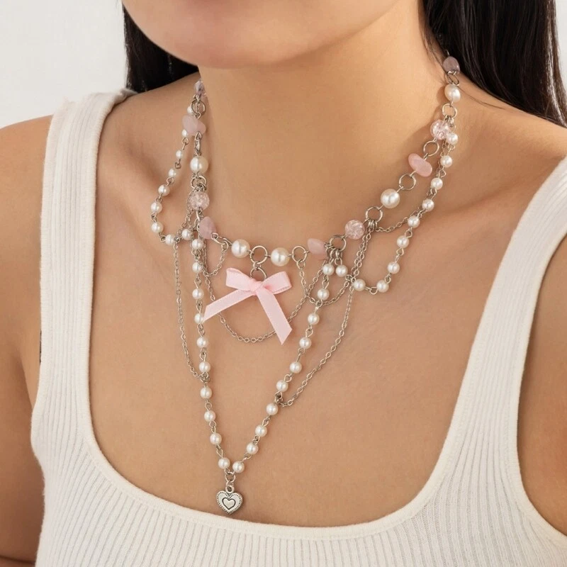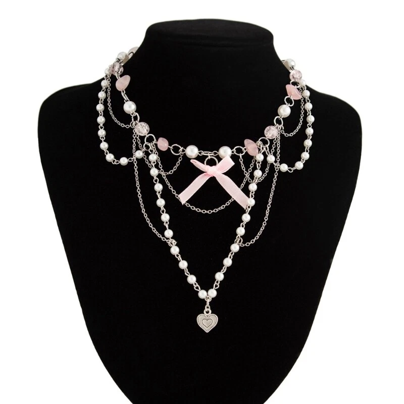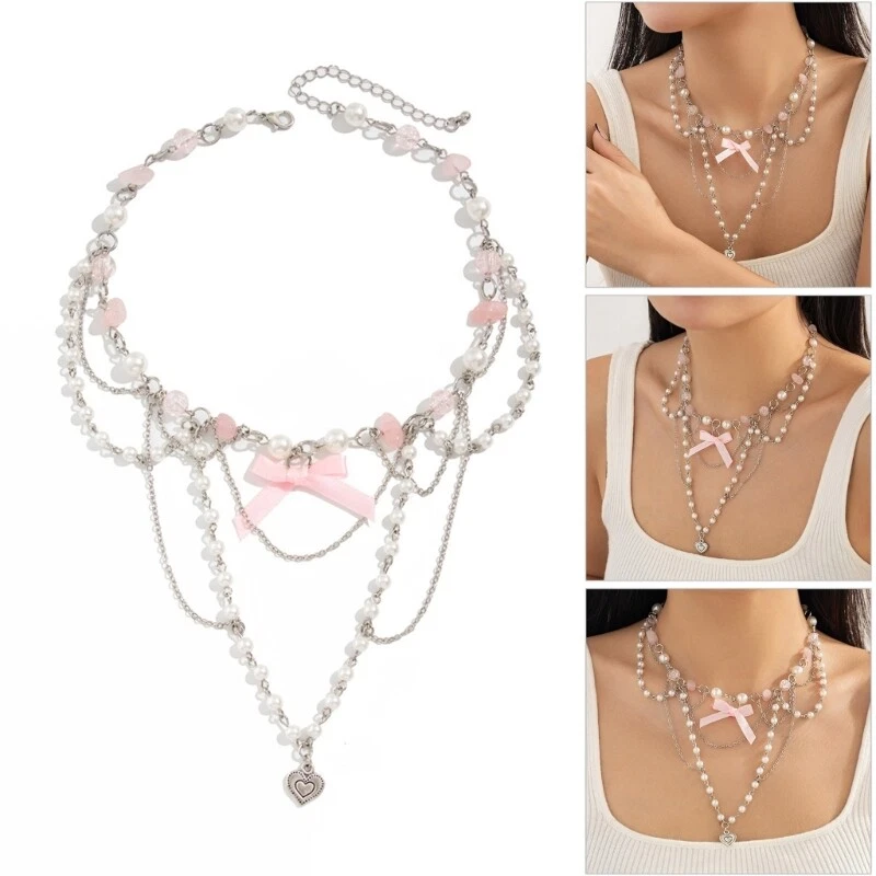 Elegant Bowknot Heart Pendant Necklace with Faux Pearls Jewelry for Trendy Women