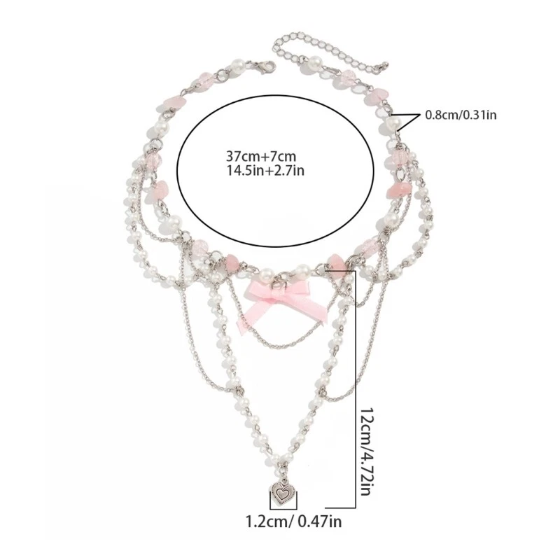 Elegant Bowknot Heart Pendant Necklace with Faux Pearls Jewelry for Trendy Women Features: Elevates your with this bowknot heart pendant necklace, featuring a combination of pearls and heart shaped pendant, for adding a touch of elegances and cuteness to any outfit. Crafted from high materials including faux pearls, plated iron chain, alloy, acrylic beads, and ribbon, this necklace offers a comfortable feel and sturdy designs that resists deformation. Suit for fashion forward women, this versatile pieces suits students, working professionals, and trendsetters alike, allowing them to showcase their charm for various occasions such as daily wear, parties, and dates, this necklace enhances your look and ensures you stand out as the center of attention. Available with adjustable length, this necklace is a essential accessory that seamlessly complements any wardrobe, making it essential addition to your jewelry collection. Specifications: Materials:Imitation Pearls+ Plated Iron Chain+Alloy+ Acrylic Beads+Ribbon Chain Length:Approx.44cm/17.32inch Heart:Approx.1.2cm/0.47inch Bead:Approx.0.8cm/0.31inch Weight:22g Package Includes: 1Pc Necklace note: 1.Please allow 1-2cm errors due to manual measurement, make sure that you donot mind before you order. 2.Due to the differences between different monitors, the picture may not reflect the actual color about the item.