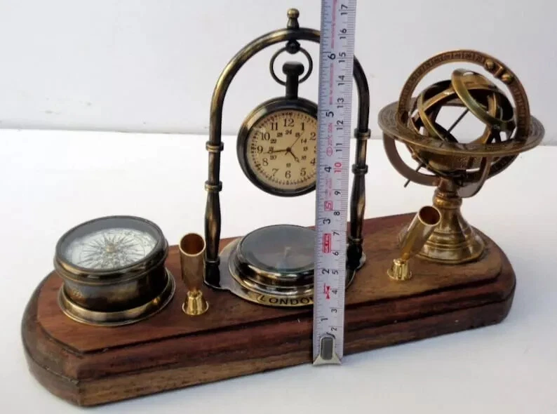 Brass Tabletop Clock with Pen Holder, Compass & Armillary Sphere – Vintage Desk Décor Elegant & Functional Antique Reproduction Enhance your workspace or home décor with this exquisite handcrafted brass tabletop clock featuring a pen holder, compass, and armillary sphere . This vintage-inspired piece is a perfect blend of utility and sophistication, making it a timeless gift for professionals, collectors, and antique enthusiasts. Product Specifications: ✅ Material: Premium Brass & Wood ✅ Finish: Brass Polish Finish for a classic vintage look ✅ Size: ✔ Length: Approx. 11 inches ✔ Width: Approx. 4 inches Why Choose This Unique Antique Desk Clock? ✔ Vintage Elegance – A perfect blend of heritage design and functional appeal ✔ Premium Quality Craftsmanship – 100% handcrafted in India by skilled artisans ✔ Perfect Gift Idea – Ideal for antique lovers, executives, and history enthusiasts ✔ Multi-Functional Design – Combines a clock, pen holder, compass, and armillary sphere ✔ Collector’s Item – A must-have for vintage collectors and interior decorators Ideal for Various Settings: ✨ Home & Office Décor – Adds a touch of vintage sophistication to your desk ✨ Gifting – Perfect for birthdays, anniversaries, corporate gifting, and holiday presents ✨ Nautical & Antique Collectors – A remarkable piece for those who appreciate historical artifacts Shipping & Delivery: 📦 Fast & Secure Shipping – We dispatch within the given working days after payment confirmation via trusted couriers (FedEx, DHL, TNT, or EMS). 🚚 Tracking Provided – A tracking number will be shared after dispatch. ⏳ Estimated Delivery Time: Delivery typically takes a few working days, but may vary due to customs clearance, address changes, or transit conditions . Customs & Import Duties: 📌 Important Note: Buyers are responsible for import duties, VAT, and other customs fees in their respective countries. 📌 Check with Customs: Please confirm these additional costs with your local customs office before purchasing. Customer Support & Satisfaction Guarantee: 💬 Have Questions? Contact us via the eBay Message system or click "Ask a Seller" below. We respond within 24 hours . ⭐ 100% Customer Satisfaction Guaranteed – If you have any issues, reach out to us, and we’ll ensure a fast and effective resolution . Special Offers: 💰 Exclusive Discounts for Bulk & Wholesale Orders! Contact us for special pricing. 🎁 Add this timeless antique brass tabletop clock to your collection today!