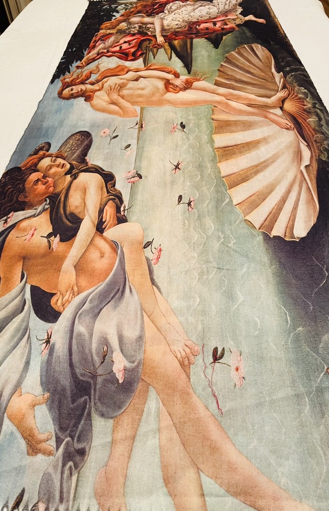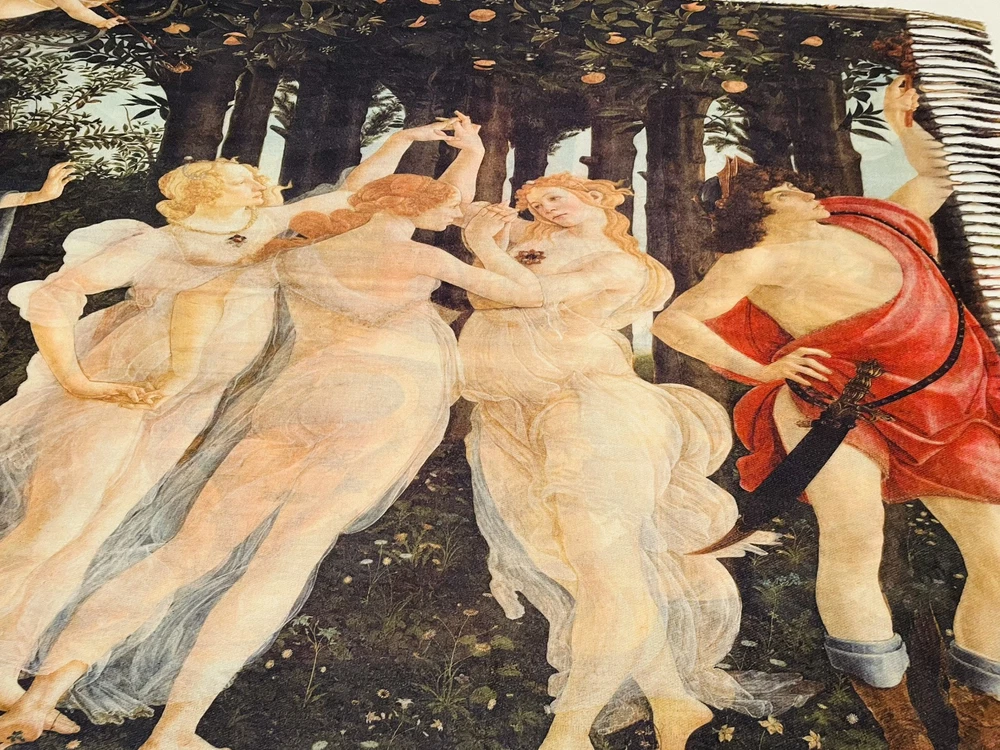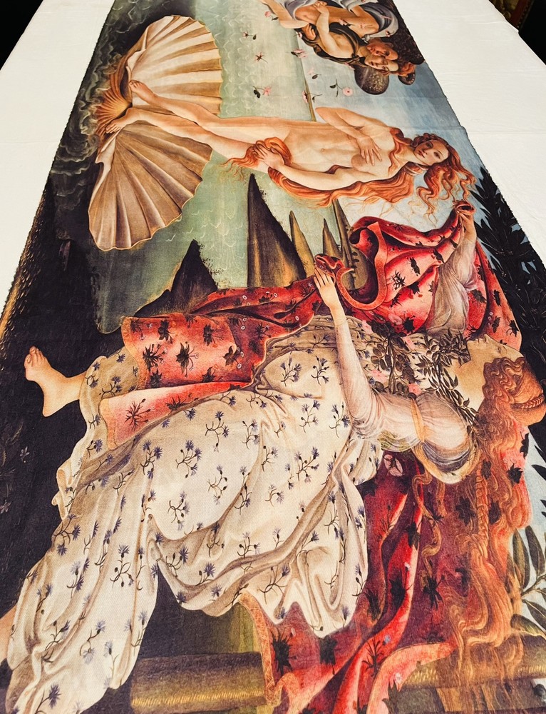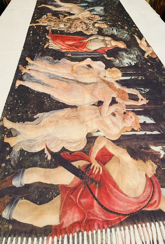 The scarf is reversible. On one side is the reproduction of Sandro Botticelli the famous painting "Primavera" and other side- ''The Birth of Venus'' Unique, luxurious, high-quality, soft, warm, durable, elegant and versatile Size: 72''x 28'' and 80'' x 28'' with fringe Viscose 50% and cashmere 50% Was purchased in Europe. New with tag. From clean, smoke-free environment. Please check my collection for more impressionist artist design scarves.
