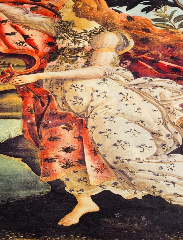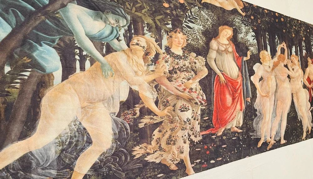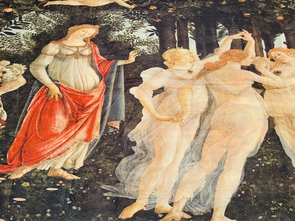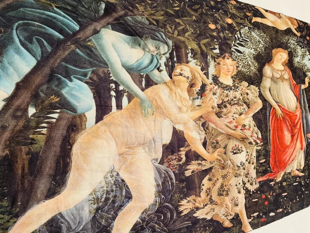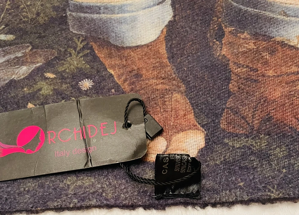 The scarf is reversible. On one side is the reproduction of Sandro Botticelli the famous painting "Primavera" and other side- ''The Birth of Venus'' Unique, luxurious, high-quality, soft, warm, durable, elegant and versatile Size: 72''x 28'' and 80'' x 28'' with fringe Viscose 50% and cashmere 50% Was purchased in Europe. New with tag. From clean, smoke-free environment. Please check my collection for more impressionist artist design scarves.