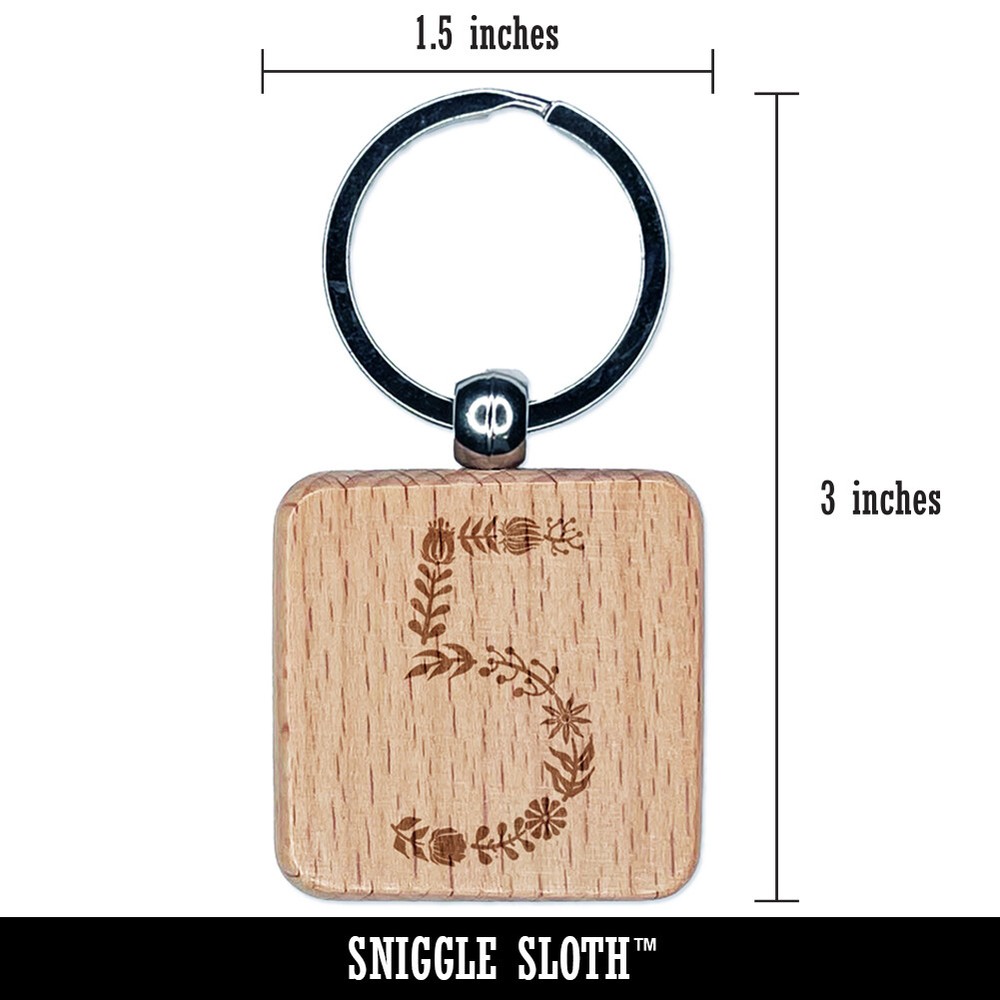 Elegant Botanical Floral Letter M Engraved Wood Square Keychain Tag Charm