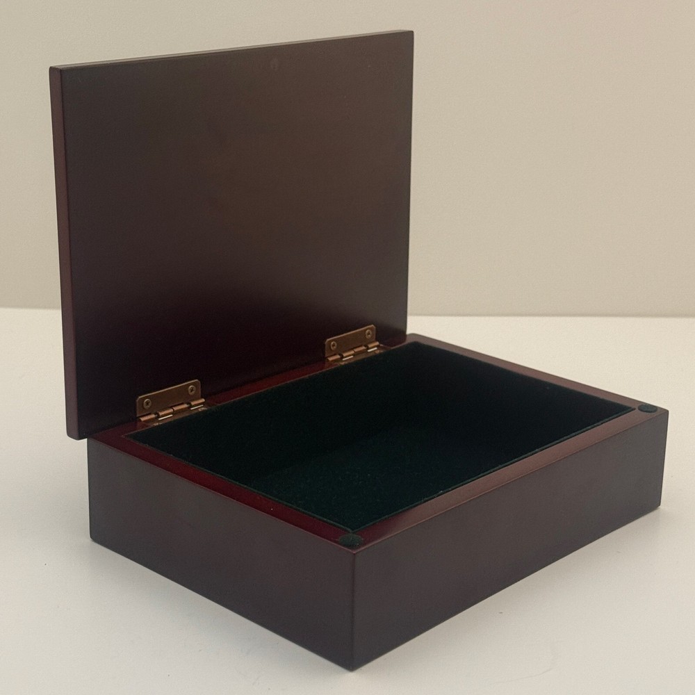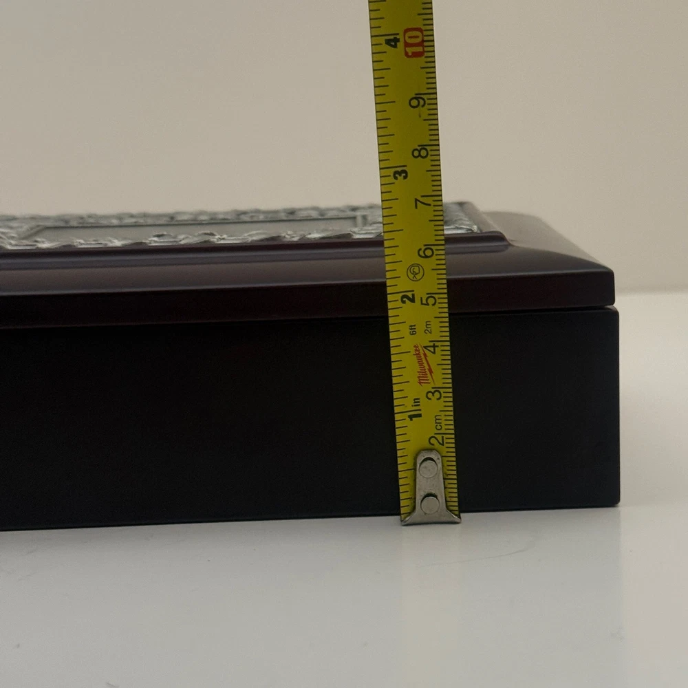 Wooden Jewelry Box with Floral Metal Inlay – 7.5 x 5.5 x 2 inches. Pre-owned item in good condition. The wooden box shows some scratches on the bottom from previous use, but the exterior and floral metal inlay are well-maintained. The velvet interior remains in good condition. Ideal for storing jewelry or trinkets, this box is both functional and stylish. Please refer to the photos for a closer look at its condition. The pictures are of the exact item you will receive. Please check the photos for more details. Please note that this item might have a slight smell of smoke due to storage and the cardboard box used for shipping. We take great care in cleaning and carefully packing the item to minimize any potential odors. Additionally, we prioritize fast shipping to ensure the item arrives quickly and in excellent condition. If you have any concerns, feel free to contact us before purchasing. Thank you for your understanding!