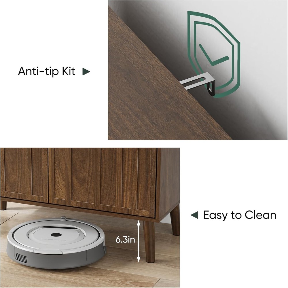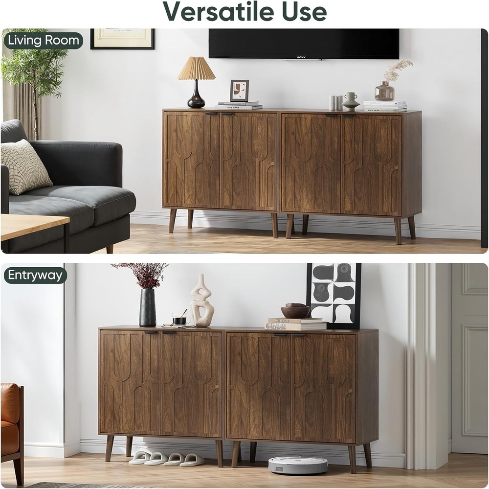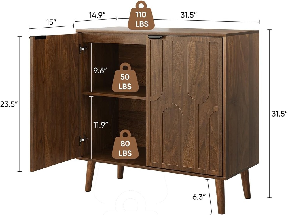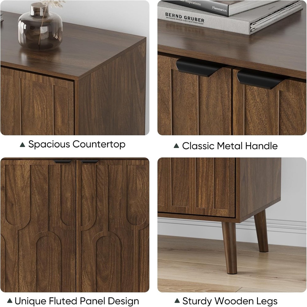 Product Description About this item Elegant Fluted Design: Features gracefully curved fluted panels that create a sophisticated textured look. Crafted in a warm walnut wood tone, this versatile sideboard complements any decor, from traditional farmhouse to modern contemporary. Ample Storage Space: Generous dimensions (31.5" L x 14.9" W x 31.5" H) house two spacious compartments. Customize storage with the removable shelf for small items or large belongings, maximizing every inch of space while keeping things tidy. Versatile for Any Room: Effortlessly adapts to your space. Use it as a chic coffee bar in the living room, a functional buffet in the dining area, or stylish entryway furniture. Its multi-functional design seamlessly blends storage and display to elevate your decor. Sturdy & Durable Construction: Built to last with premium MDF wood, featuring anti-tip hardware, scratch-resistant, and waterproof finishes. Easy Assembly: Comes with step-by-step instructions and clearly numbered parts for straightforward setup. Our dedicated seller support team is ready to assist within 24 hours for any missing hardware, damaged parts, or assembly questions. Exclusive Geometric Wood Accent Door Front Each cabinet door boasts a striking geometric inlay design. Thin strips of real wood are expertly applied, forming a seamless, interlocking loop motif that catches the light and the eye. Two Generous Storage Spaces Inside Ideal media companion: Keep routers, cables, DVDs, and console accessories neatly hidden yet easily reachable in the two spacious cavities Living room essential: Store throw blankets, extra pillows, remotes, and gaming controllers in one bay, while board games, magazines, or decorative baskets find a home in the second Tame the entryway chaos: Perfectly sized for shoes, bags, dog leashes, and mail in one compartment, with room for scarves, hats, or seasonal items in the other On Aug 14, 2025 at 03:13:50 PDT, seller added the following information: