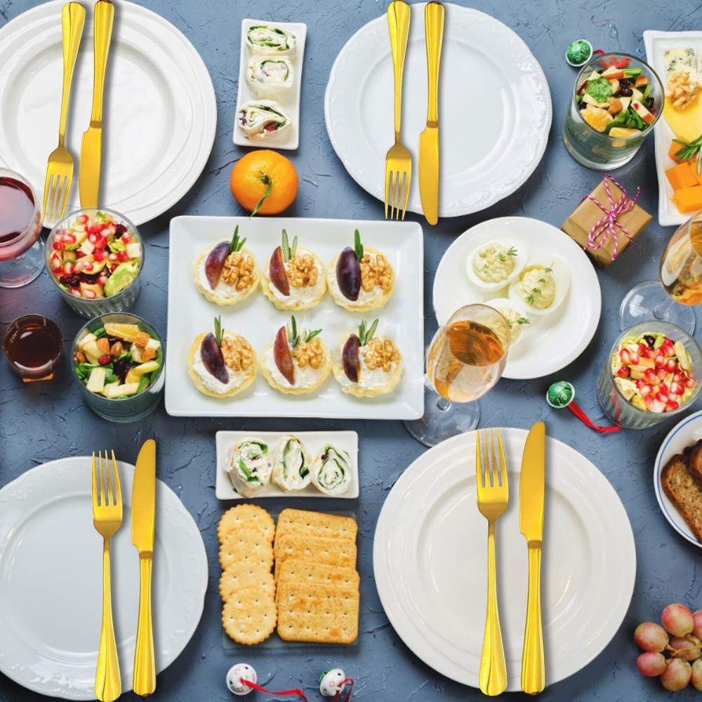 24 piece gold silverware set: Includes 6 each dinner spoon, dinner fork, dinner knife, teaspoon, packaged in a nice gift box, perfect gift for Housewarming, Thanksgiving, Christmas Quality material: This 24 piece cutlery set with serving pieces are made of haavy premium 18/10 stainless steel which ensures your health, Sturdy enough to stand up to everyday use, Rust resistant and durable for years to come Widely use: Nice stainless steel gold flatware set for 6, great Ideal for everyday home use, hotel, restaurant, entertaining, party, buffet, bistro, camping, picnic Exquisite craftsmanship: Smooth surface and mirror polish makes these tableware set always keep shining, simple classic modern design would match well with your existing cutlery and elevate everyday meals into a fine dining experience Easy clean: Polished stainless steel dinnerware set is very easy to clean, we recommend wash it by hand. The flatware set is healthy for your everyday use Gift choice: This elegant golden tableware is perfect for your friends’ housewarming, wedding, birthday, it will be the most shining gift they ever received