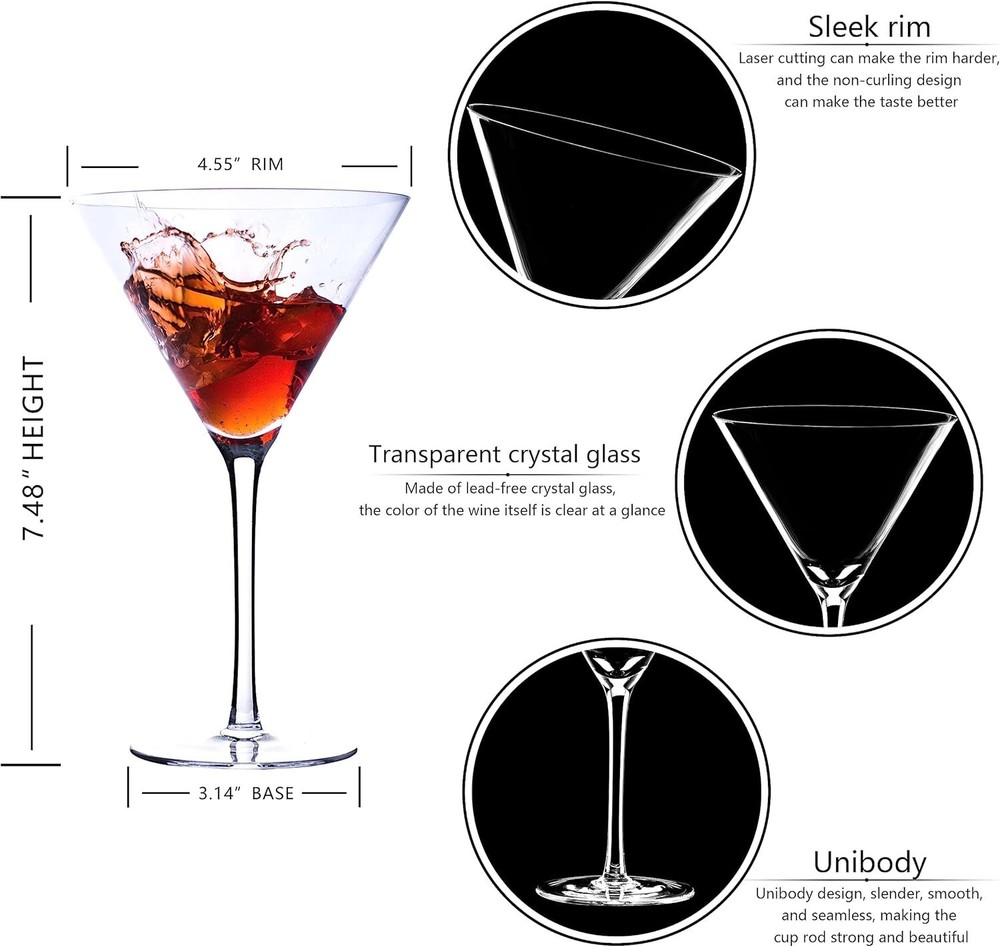 Handblown Crystal Martini Glasses Set of 4-9.5 oz Coupe Glass Set with Stem - Elegant Cocktail Glasses for Bar, Margarita, Cosmopolitan, Manhattan, Gimlet - Unique Gift for Mother’s Day A Magnificent Way to Serve Your Fine Drink - Nothing can elevate the refreshing taste of a cocktail more than serving it in luxurious glasses. The sophisticated design of Martini Glasses will give your drink a refined note, making every sip a memorable experience. The wide rim is carefully cut and polished to direct the cocktail to the center of the tongue, creating a harmony of flavors. High-Quality Martini Glass --- Our high-quality Martini glass is the secret to a 30% enhanced taste and a demonstration of the restaurant’s quality. Its light and thin wall offers an elegant appearance for the Martini. Handcrafted --- Each Martini glass is hand-blown by an experienced master craftsman, by whom the edge is delicately polished and cut for a thin and smooth appearance to provide a better sense of touch for your lips and enhance the quality and flavor of the Martini. The Perfect Gift --- Our Martini glass will not disappoint you, whether it is for your own use or as a gift for others. It will impress everyone, whether it is your wife, husband, father, mother, siblings, or a Martini lover, and it will serve as a unique gift to celebrate life's important moments, whether it is anniversary, a wedding, Halloween, Christmas, an evening party, or a family party. 100% Leadless Crystal --- glass is 100% leadless with endurable and transparent crystal glass which reflects the true quality of Martini.