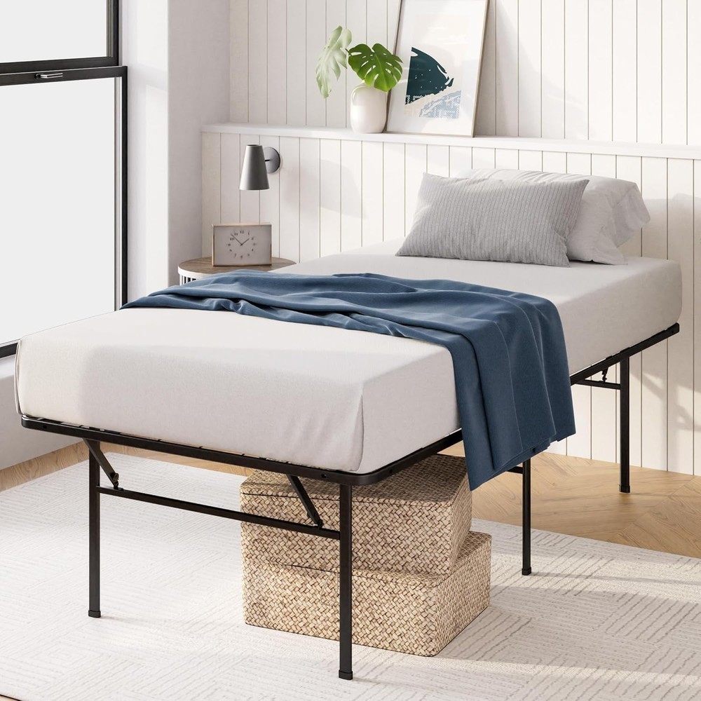 Mattress Included: No Type: Platform Bed Compatible With Mattress Size: Twin EPREL Registration Number: 841550084016 Product Care Instructions: Wipe With Dry Cloth Included Components: Foundation, Installation Manual, Legs, Slat Unit Count: 1.0 Count Compatible Mattress Size: Twin Color: Black Country of Origin: China Room: Bedroom Additional Parts Required: No Distance from Floor to Bottom: None Shape: Rectangular Features: Quick, Tool-Free Assembly, Underbed Storage, Recessed Legs Product Dimensions: 75"l X 39"w X 18"h Style Name: 18" Department: Adults UPC: Does Not Apply Assembly Required: Yes Personalized: No Required Assembly: Yes Finish Types: Painted Care Instructions: Wipe with Dry Cloth Maximum Weight Recommendation: 1500 Pounds Item Weight: 21.38 lb Frame Material: Steel, Alloy Steel Item Depth: 18 Inches Style: Contemporary/Modern Other Special Features Of The Product: Durable, No Box Spring Needed Number of Drawers: 0 Global Trade Identification Number: 00841550084016 gtin13: Does Not Apply Finish: Painted Brand: Unbranded Furniture Finish: Alloy Steel Item Type Name: Smartbase Item Dimensions: 75 X 39 X 18 Inches Item Dimensions L X W X H: 75"l X 39"w X 18"h