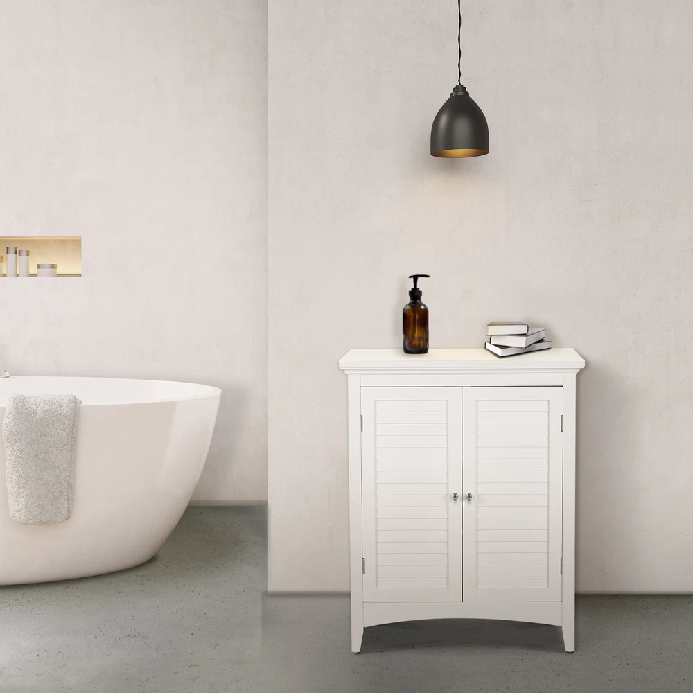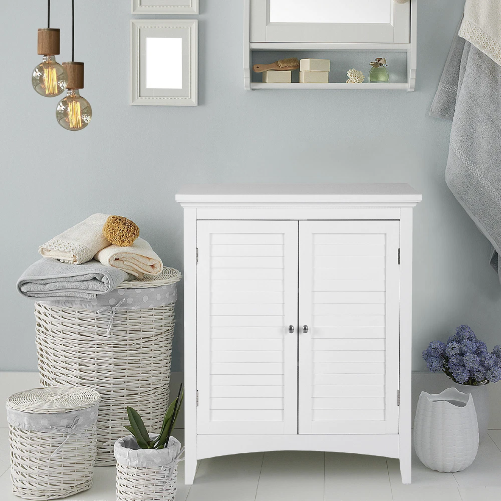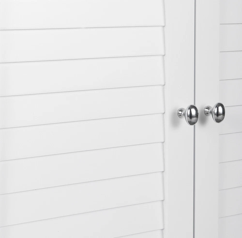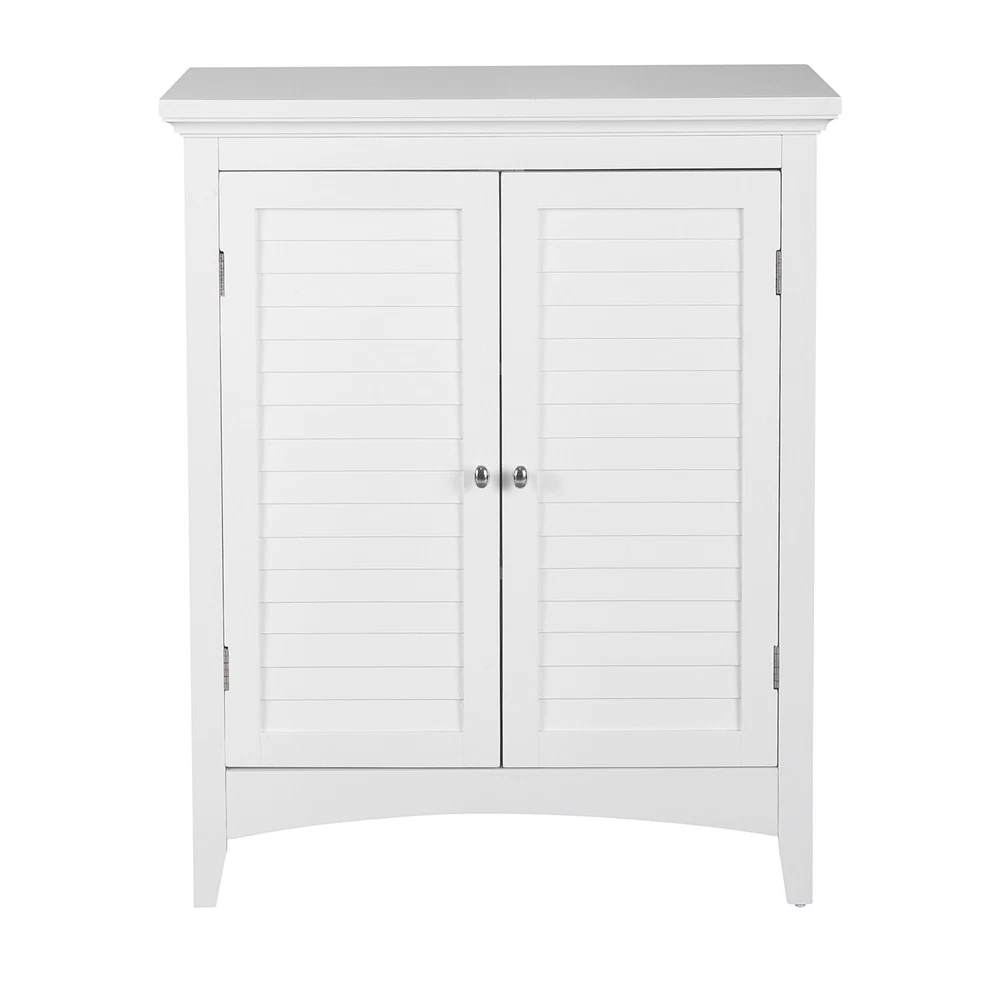 Upgrade your home storage while adding classic style with the Elegant Home Fashions Glancy Wooden Floor Cabinet with Shutter Doors. This decorative cabinet features a timeless white finish with a crown molded top and skirting, chrome-finished knobs, louvered doors, and shaker-style legs for a beautiful addition to your space. The included fixed shelf and an adjustable shelf make this cabinet functional and customizable to suit your storage needs. Constructed from durable engineered wood with included anti-tipping hardware, this storage unit is built to provide you with long-lasting organization. Easy, step-by-step instructions and all of the hardware needed for installation are included for quick assembly Elegant Home Fashions Glancy Two Shutter Doors Wooden Storage Stand Floor Cabinet White Features Featuring crown molded top, shaker-style legs and a pair of faux louvered doors in white Two interior adjustable shelves to help reduce clutter and keep your home tidy, without making permanent changes Made of sustainable engineered wood that is less likely to warp, crack, or rot than solid wood Magnetic latch ensures a gentle, silent close, eliminating door slamming Dimensions: 25.98" L x 12.99" W x 32.01" H SKU:ELG-585 The Teamson Home Glancy Freestanding Floor Cabinet is a versatile storage solution featuring a white finish and faux louvered doors that stay closed with a magnetic latch. Shaker-style legs, crown molding on top, and a pair oval-shaped satin nickel knobs blend to create a decorative, functional cabinet. Made of engineered wood, a pair of interior adjustable shelves can be used to customize storage.