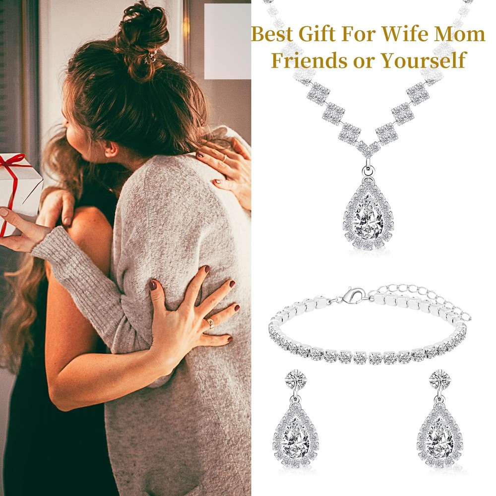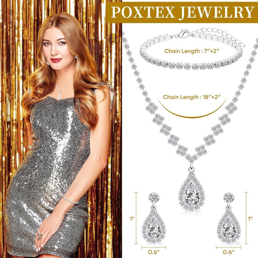 Bridal Silver Jewelry Set for Wedding, Hypoallergenic Crystal CZ Tennis Bracelet Dangle Earrings Necklace Set, Rhinestone Teardrop Wedding Jewelry for Bridal Bridesmaid Prom Party Costume Product Details Package Dimensions : 3.19 x 3.15 x 0.75 inches; 1.45 ounces Department : womens Date First Available : July 27, 2023 Manufacturer : Poxtex Country of Origin : China Brand, Seller, or Collection Name: Poxtex Metal: Brass Material: Silver Gem Type: Cubic Zirconia Clasp: Lobster Clasp Number of stones: 37