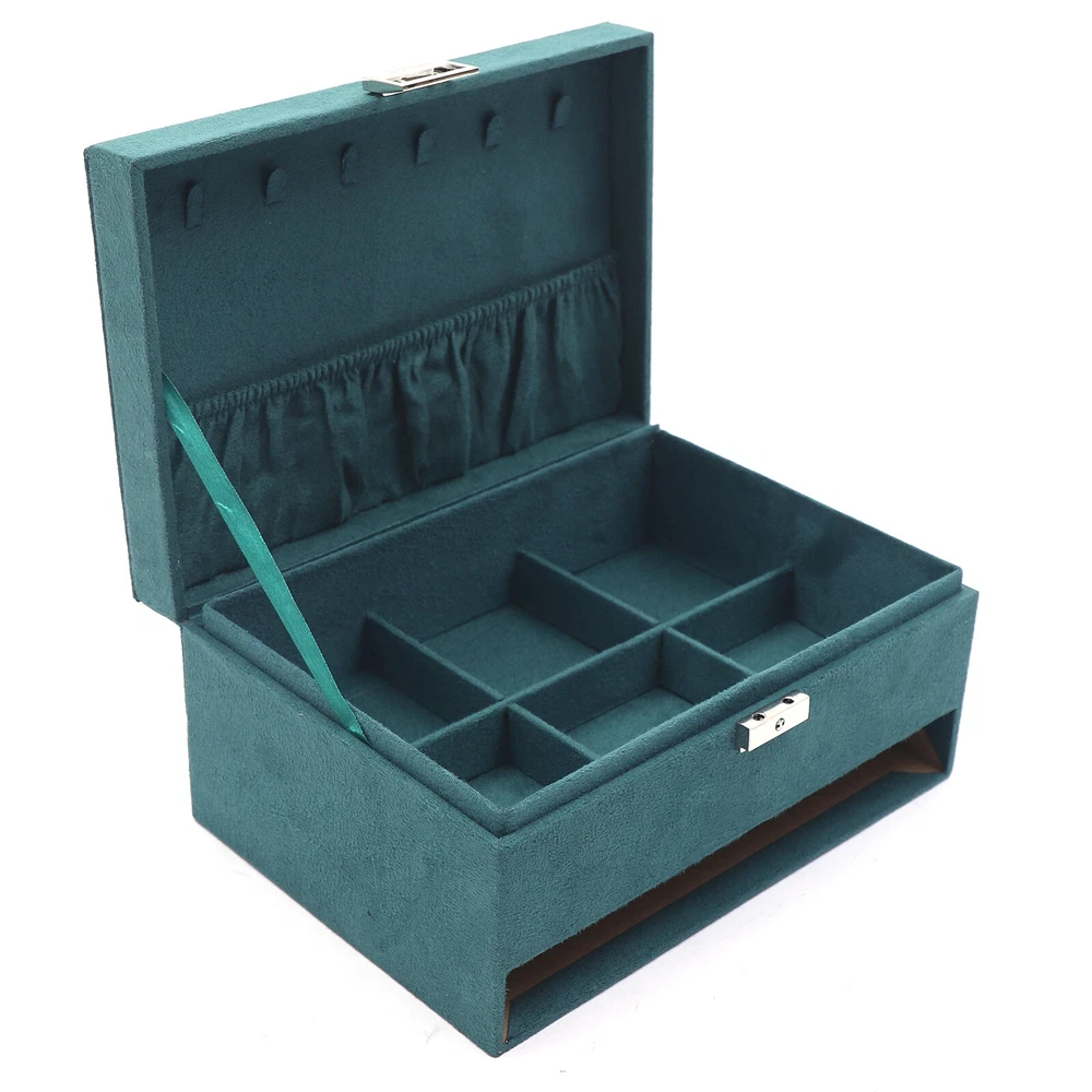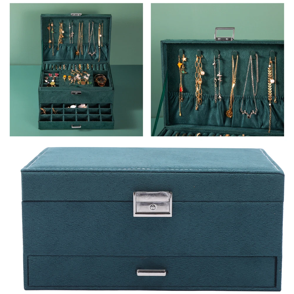 Description The interior of this jewelry box is very cleverly designed. It has multiple dividers and drawers that make sorting and organizing jewelry a breeze. Whether it's necklaces or bracelets, rings, or earrings, it all has a dedicated space that enables you to quickly find the jewelry you want. It's more than a simple organizer, it's a piece of art and a fashion accessory. With it, your jewelry will not be scattered in a drawer, but have a comfortable, safe, and beautiful home. Details Hook: It is suitable for hanging bracelets, necklaces, jumper chains, and so on, convenient for you to find and locate quickly. Safety Lock: It is durable, not easy to break, and easy to open and close, so your jewelry can be kept safe at all times. Exquisite Handles: The drawer has a small and delicate handle for easy pulling out. Round Corners: The edges of the jewelry box are very round, which can better protect your safety.