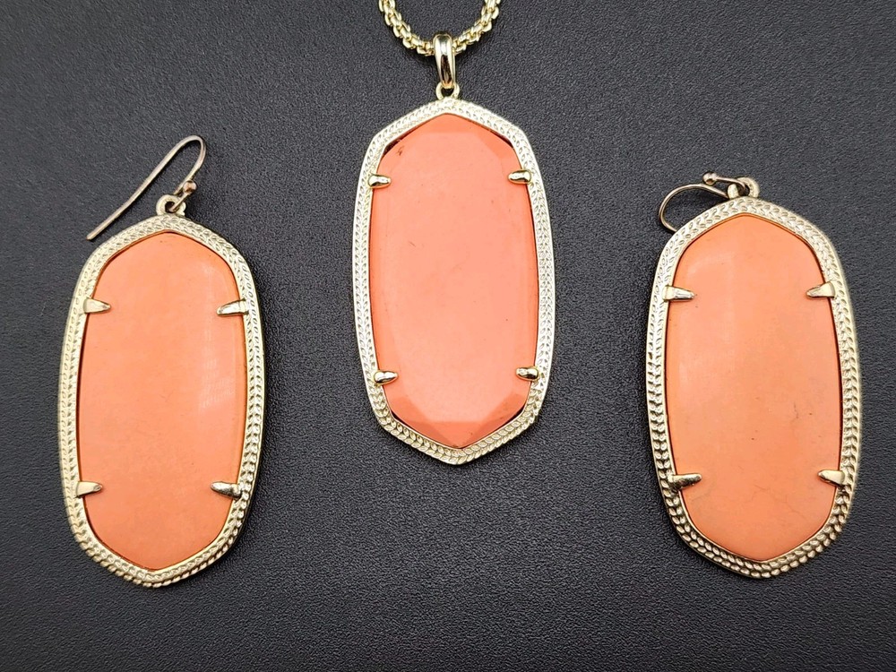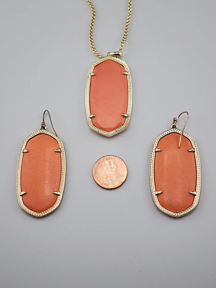 This Kendra Scott Daniel jewelry set includes a coral stone necklace and earrings, perfect for both casual and formal occasions. The elegant pieces are made from stone materials in coral and with a gold-tone metal bezel setting, adding a touch of sophistication to any outfit. With a theme inspired by music, dance, and fashion, this set is sure to elevate your look with its intricate designs and high-quality craftsmanship.