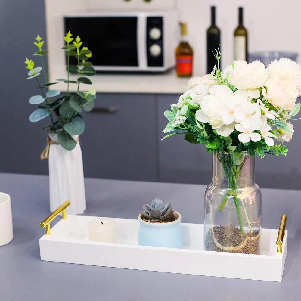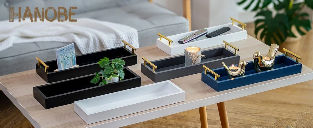 Hanobe Rectangle Long Narrow Tray: Decorative Trays Rectangular Candle Holder Trays for Home Decor White Centerpiece Tray Decor Serving Tray with Gold Handles for Dining Table Coffee Bar Living Room HIGH QUALITY - Measures:16.3"x4.8"x1.66", The rectangular storage tray is made of high quality MDF wood material with a navy blue/white /black paint coating for a smooth and glossy surface and polished metal handles to make it easier to serve or pick up items for guests. DECORATIVE - Add your favorite pillar candles to create a unique candle holder tray or add orbs to make an interesting centerpiece for your dining table. Or place vases with flowers, rocks-capes, small planters and other decorative items to provide eye-catching and stylish accessories for your home. MULTIFUNCTIONAL & OCCASION - The wooden trays for decor not only suit for home centerpiece decor, counter storage box, living room, kitchen, bathroom organizer but also can be used as a coffee, wine, drink long serving tray . It’s also a reliable helper for various occasions like Christmas, birthday, wedding and parties. STYLISH GOLD HANDLES - The long wooden tray added stylish and thick metal gold handles to each side of smal serving tray rectangular to be easily transported with ease when needed, add more thoughtful edge depth is to prevent items from falling off. WARRANTY: Hanobe always put customer satisfaction in our top-priority position and offer 12 months quality assurance and LIFETIME professional customer service. If you have any problems with our products or services, please feel free to contact us anytime, we’ll get back to you within 24 hours. Buy with confidence! Shipping We offer FREE shipping on all orders! We ship within Three business days of payment, usually sooner. We use a selection of shipping services such as UPS, FedEx, USPS etc. We only ship to the lower 48 states, no APO/FPO addresses or PO Boxes allowed. Local pickups and combined shipping options are not provided at this time. International buyers – please note: Import duties, taxes, and charges aren't included in the item price or postage cost. These charges are the buyer's responsibility. Please check with your country's customs office to determine what these additional costs will be prior to bidding or buying. Order Cancellation Policy * Order Cancellation Policy ** You can return a product for up to 30 days from the date you purchased it. 1. The seller reserves the right to cancel the special case only due to eBay cancellation fee. 2. The decision of seller is the final. 3. The seller will respond to the cancellation request within 2 business days. Please wait for the result of cancellation. 4. In case the cancellation is not completed by some reasons, the buyer can follow the options below to get the refund. 4.1 The buyer can reject the item when it arrives. 4.2 The buyer can send the item back to the seller within 30 days If the buyer receives item (USA Shipment ONLY). The seller will provide the FREE return label to the buyer when the buyer opens " Return Item" case on eBay by using the reason as "Change my mind" ONLY. 5. When buyer has placed the order. The order will be processed and completed by automatic warehouse system within 5 minutes. In case that buyer sends the cancellation request after 5 minutes of placing the order, the request will be rejected. **Sending direct message to cancel the order is not allowed for every case.* Return Policy - If buyer would like to return the items for refund or replacement, please CONTACT SELLER to receive the free return label from seller. The refund or replacement will be processed with the tracking number of return label which is provided by seller only. The other ways of return which are not approved by seller will not be processed for the refund or replacement. Return You can return a product for up to 30 days from the date you purchased it. Any product you return must be in the same condition you received it and in the original packaging. Please keep the receipt. Payment We accept payment by any of the following methods: eBay Payments Please pay as soon as possible after winning an auction, as that will allow us to post your item to you sooner! Feedback Customer satisfaction is very important to us. If you have any problem with your order, please contact us and we will do our best to make you satisfied. Contact Us If you have any queries, please contact us via ebay. We usually respond within 24 hours on weekdays. Please visit our eBay store to check out other items for sale! Thank you for shopping at our store.