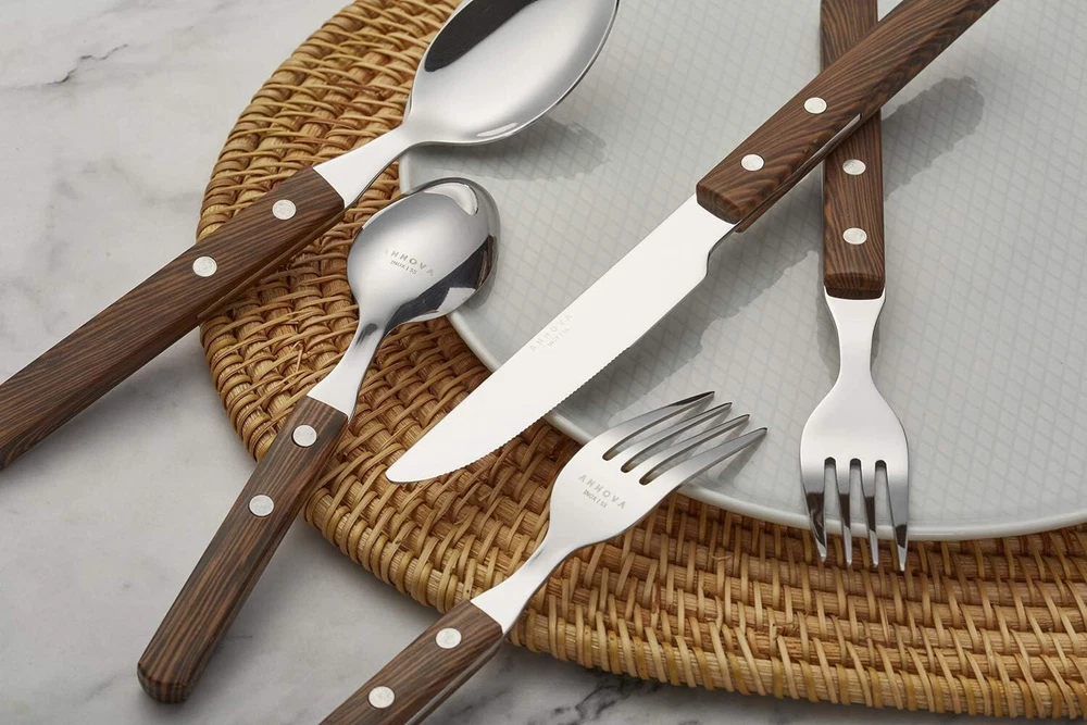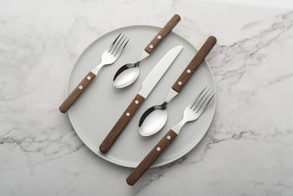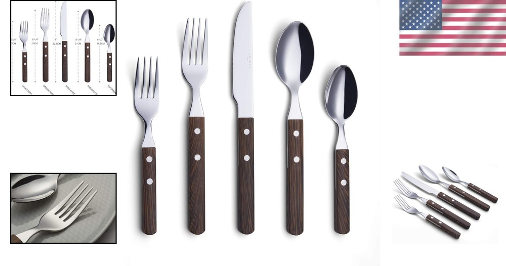 Department: Adults Item Weight: 2.1 lb Wood Tone: Dark Brown Wood Brand: Unbranded Number of Items in Set: 20 Number Of Pieces: 20 Service For: 4 Color: Walnut/Wood Recommended Uses For Product: Indoor,outdoor,camping,traval,holiday Style: Modern Type: Set Finish Type: Polished Material: Stainless Steel, ABS Occasion: Dinner Parties Product Dimensions: 16.18 X 6.38 X 1.93 Inches Care Instructions: Dishwasher Safe Is Dishwasher Safe: Yes UPC: Does not apply gtin13: Does not apply Handle Material: ABS Features: Dishwasher Safe, Rust Resistant Special Feature: Rust Resistant Set Includes: Fork, Dinner Knife, Dinner Fork, Salad Fork, Dinner Spoon, Dessert Spoon Personalize: No Finish: Polished Product Care Instructions: Dishwasher Safe Is Stain Resistant: Yes