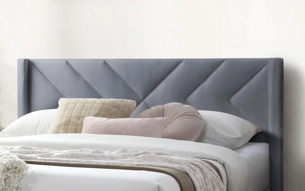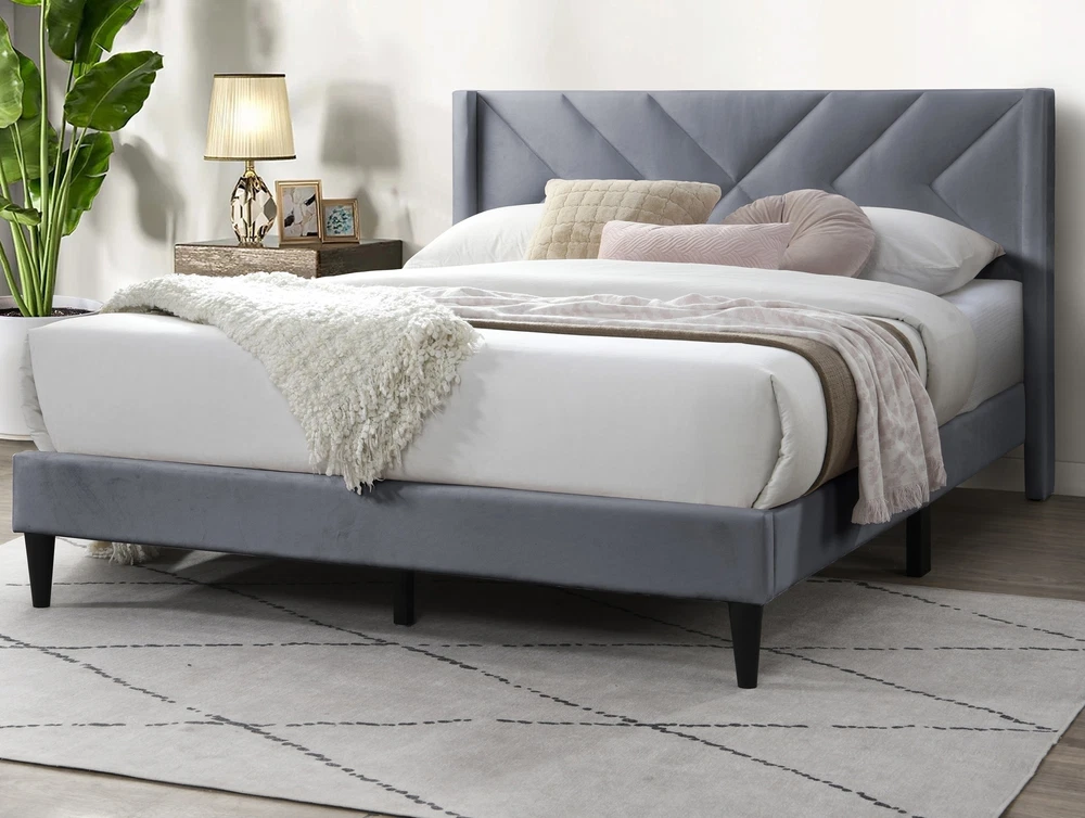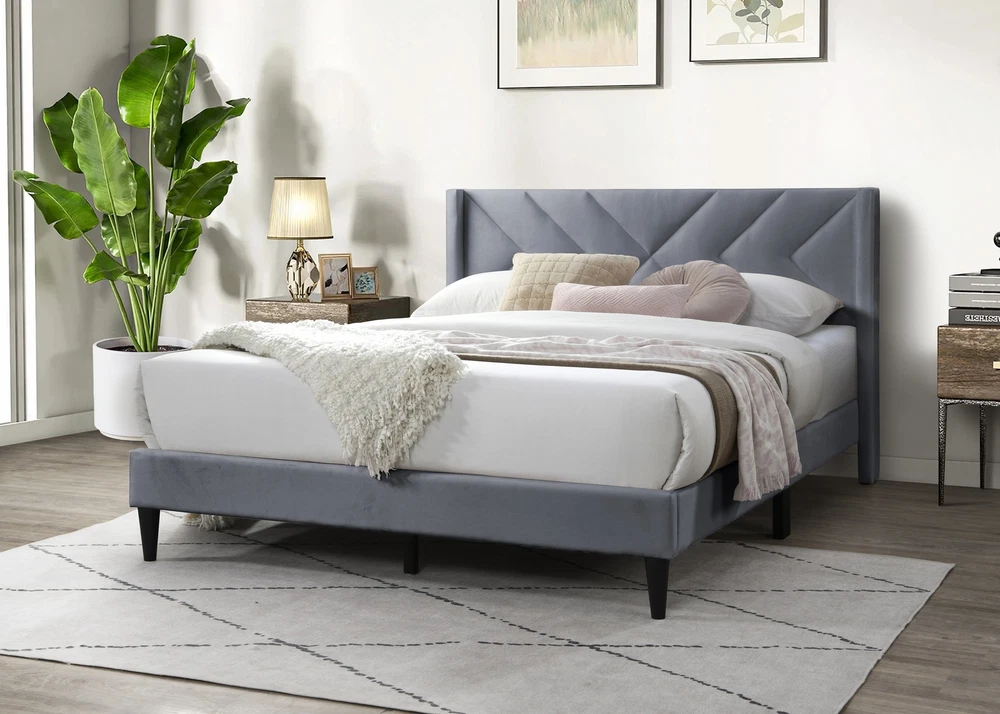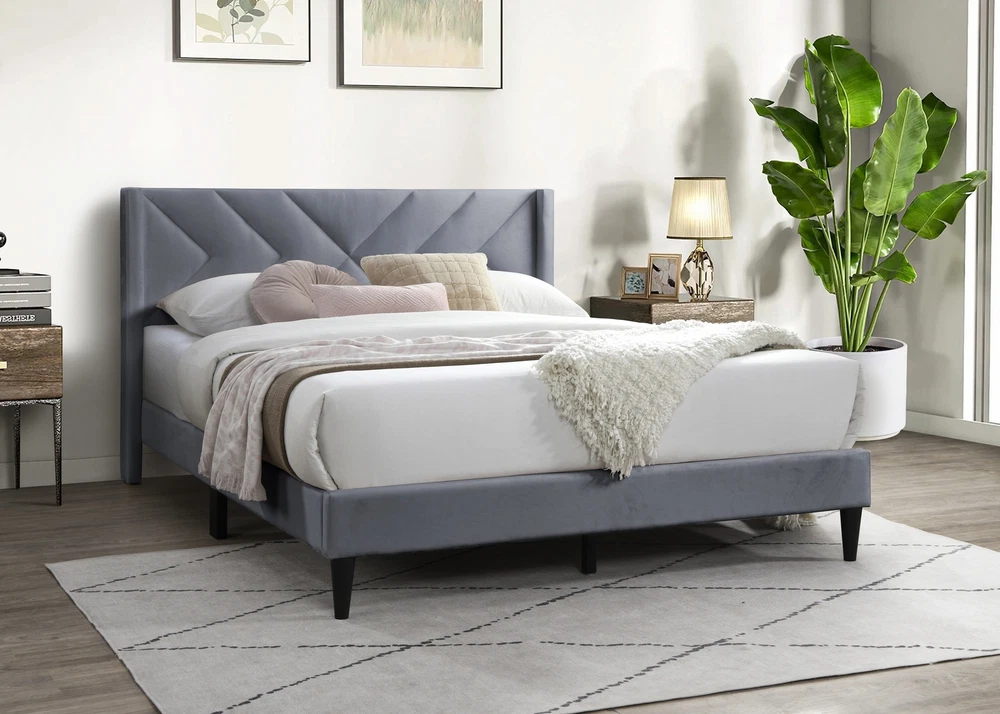 Elegant Modern Gray Velvet Upholstered Queen Size Bed Clean Lines Design Headboa
