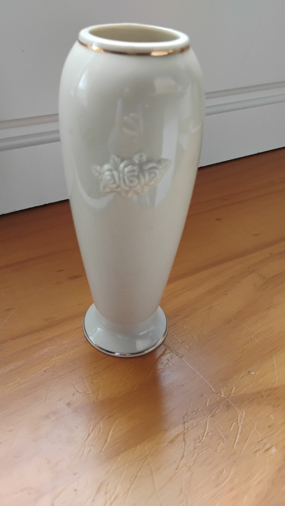 This Lenox vase is a beautiful addition to any collection. The cream-colored porcelain is accented with a rose pattern and an asymmetrical shape. The vase measures 7.25 inches in length and features a glossy finish. The vase is perfect for all occasions and will make a lovely decoration in any room. It is hand-crafted and an original piece from Thailand. The vase is designed with a bud shape and features a 24k gold trim embossed flower. This is a must-have for any collector or for someone who appreciates beautiful decorative pieces.