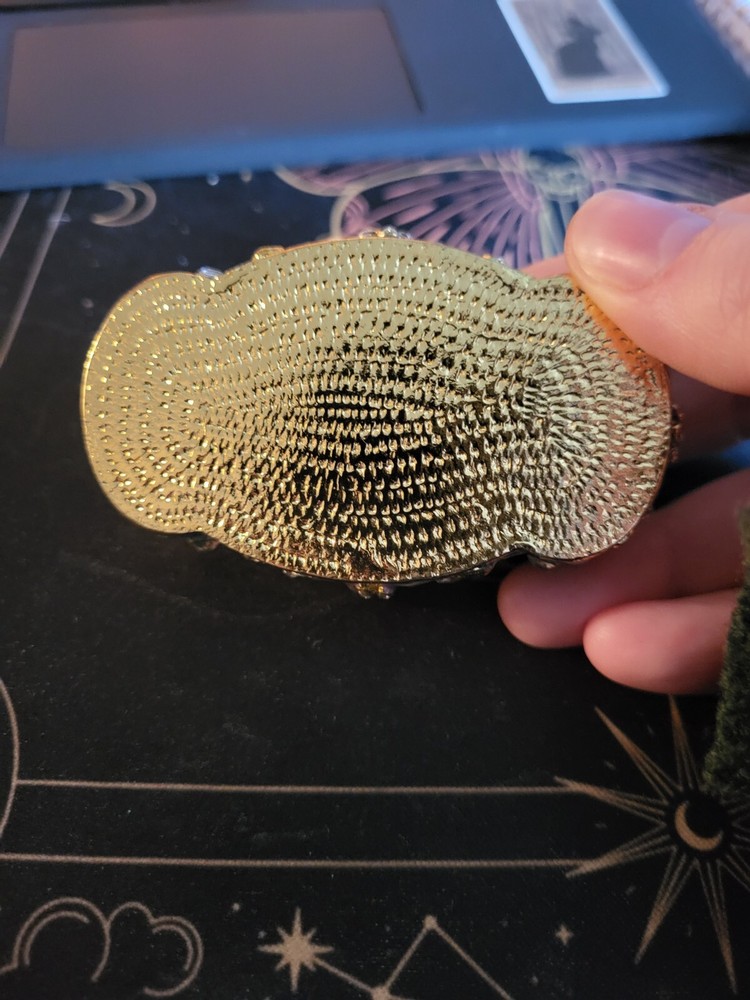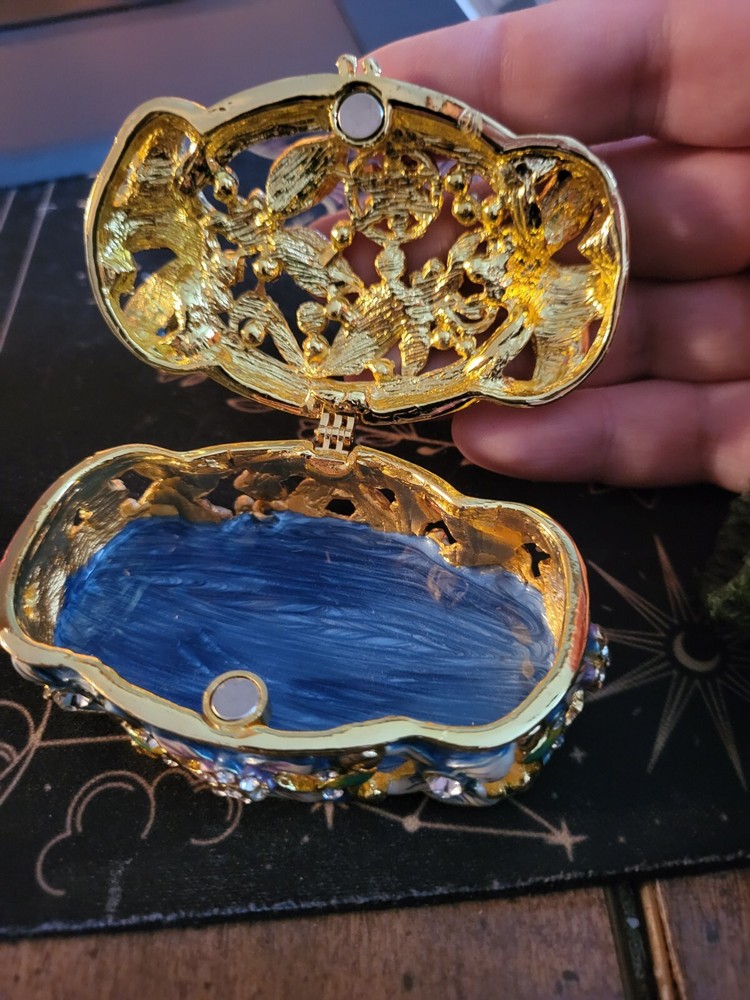 This is part of a collection I inherited looking for a new home. This is a trinket or jewelry box with a Baroque ribbon motif. It looks to be hand painted and features some small gems and gold plating. Would be perfect for a collection, a trinket shelf, or even to hold an engagement ring for a proposal.