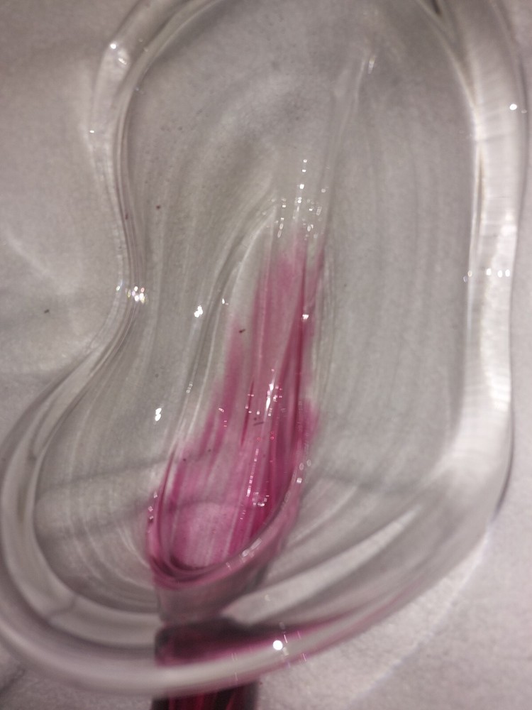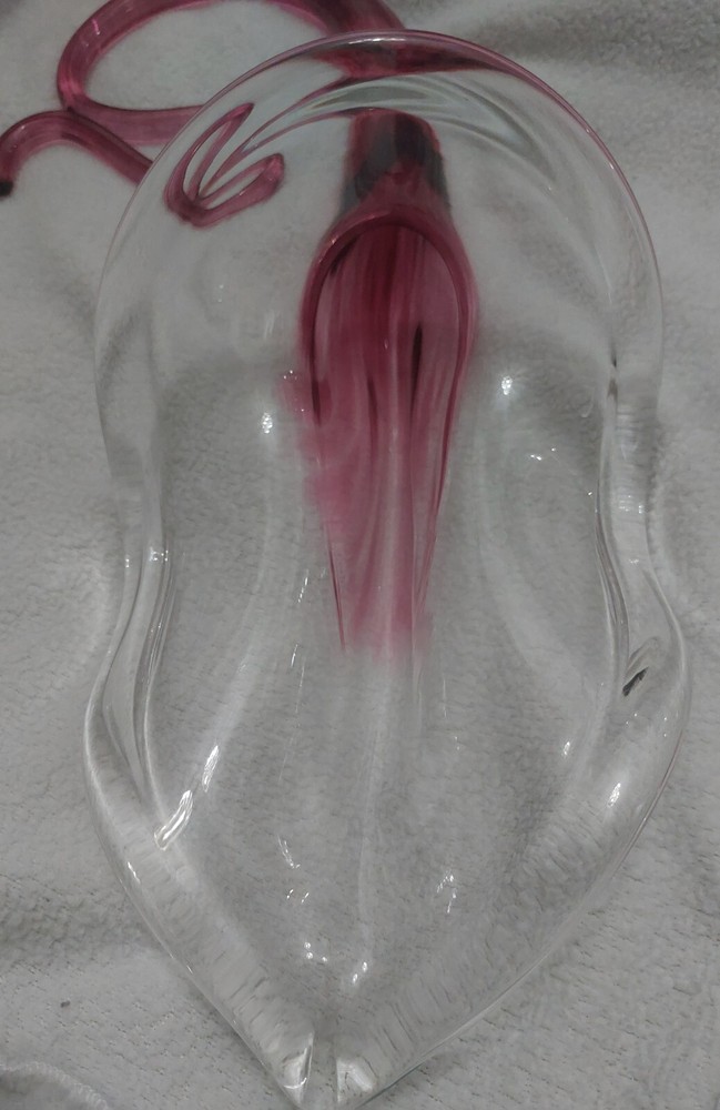 This beautiful vase is a one-of-a-kind piece from Bavin Glassworks. The unique design features a stretched lily shape, handmade with pink and clear glass using the hand blown glassmaking technique. The vase was produced in 2002 and is signed by the artist. Its impressive size of approximately 16 inches at its longest, and about 6 inches wide really catches the eye. There is a small water reservoir for water/flowers. The lily subject is perfect for collectors who appreciate decorative items, and the vase is a great addition to any collection. This piece is perfect for display in any room of your home and will be a conversation starter for sure. Don't miss out on the opportunity to own this stunning handmade glass vase from Bavin Glassworks. No chips or cracks. Experienced glass shipper. Thank you for looking!