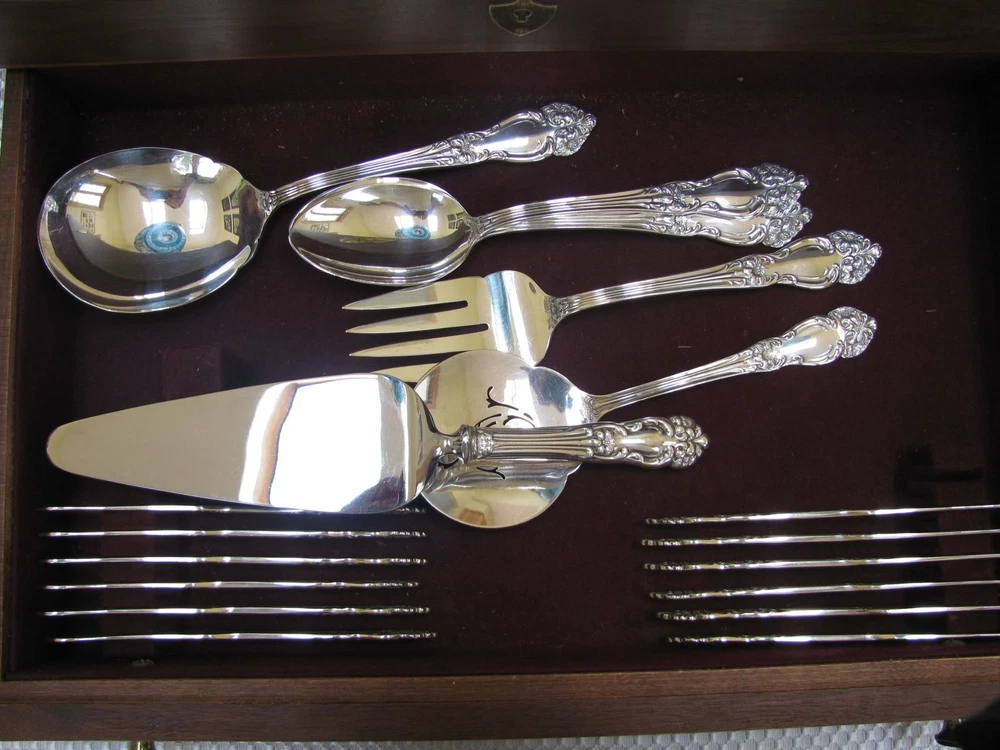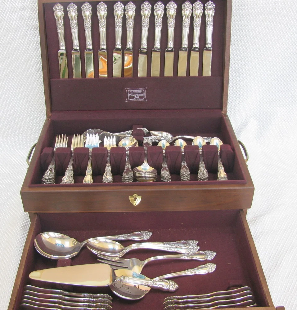 Offered for your consideration is an elegant set of vintage Reed & Barton silverplate flatware in the Tiger Lily or Festivity pattern. This pattern was originally introduced in 1901 as Tiger Lily and then reintroduced in 1945 as Festivity. Included are: 12 dinner knives 9 ½” 12 dinner forks 7 ½” 12 salad or dessert forks 6 ½” 12 round cream soup spoons 7” 24 teaspoons 5 ¾” 12 individual butter knives 5 ¾” 1 pastry server 9 ¾” 1 cold meat fork 8 ½” 1 casserole spoon 8 7/8” 2 solid serving spoons 8 1/8” 1 tomato server 7 ¾” 1 jelly spoon 6” 1 master butter knife 7” 1 sugar spoon 6” Wooden chest The flatware is stamped on the back, “Reed & Barton.” Each piece is in near mint condition. All pieces were carefully hand polished and are ready for your use. The chest is not original to the set, but will serve to keep your flatware safely. Please feel free to ask questions before you buy. This item will be shipped UPS Mail. It will be shipped within 24 hours after payment has been received. dewabit
