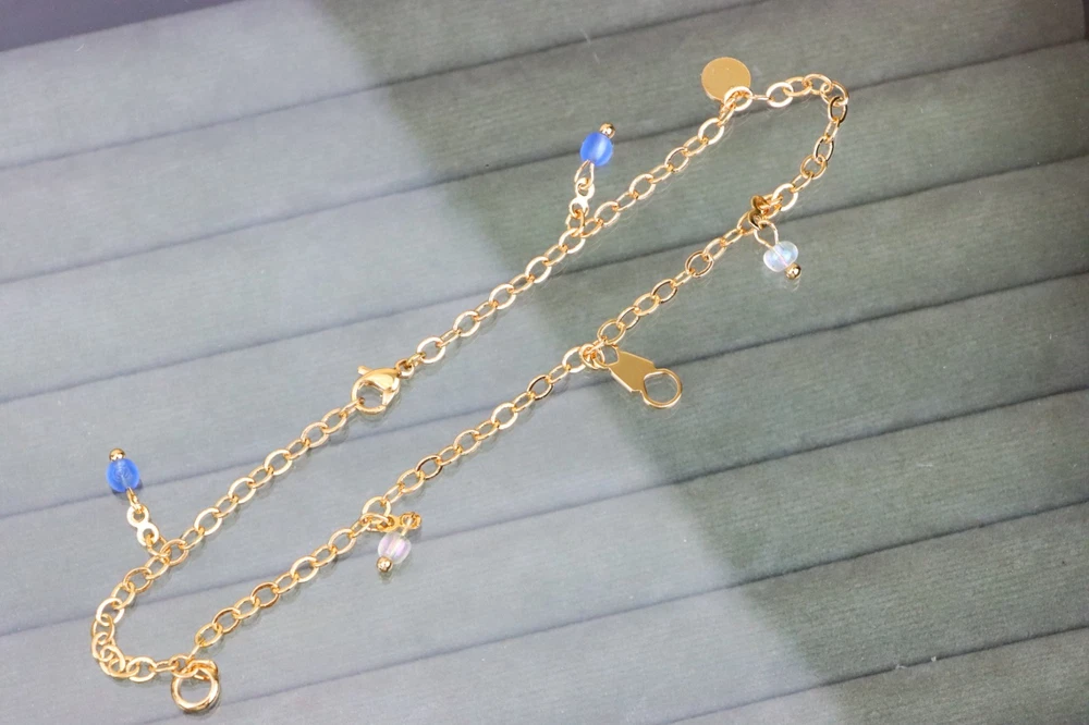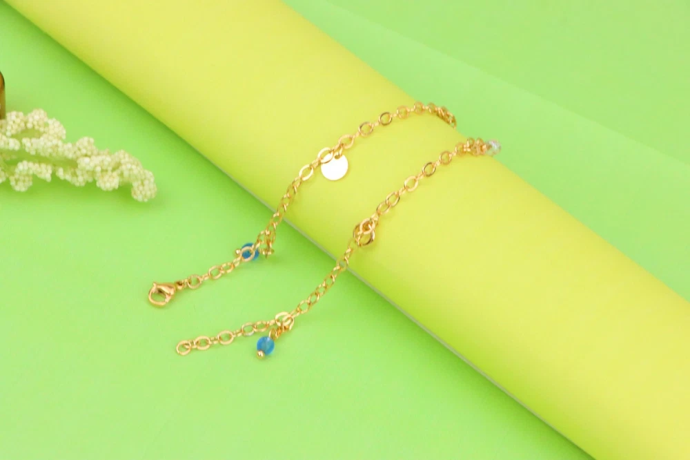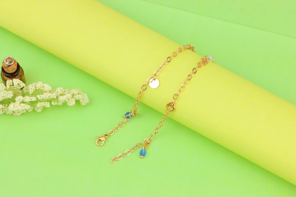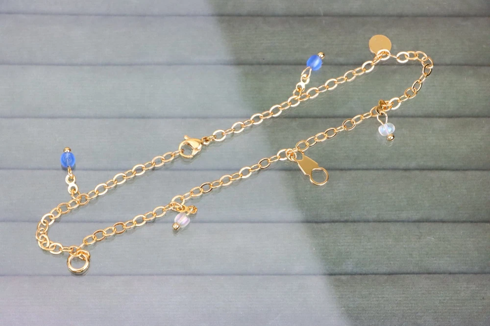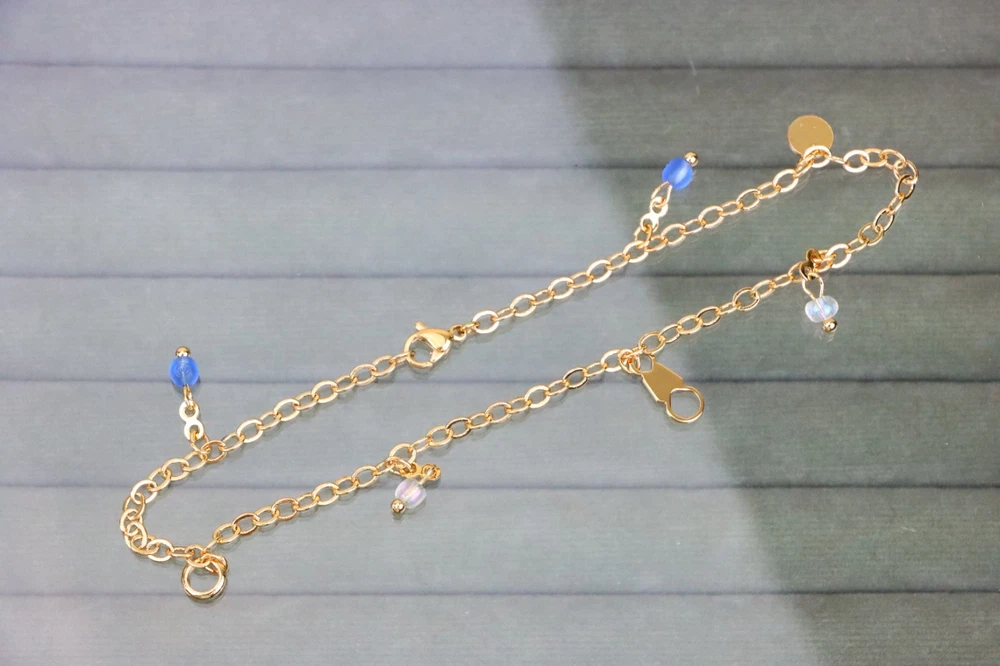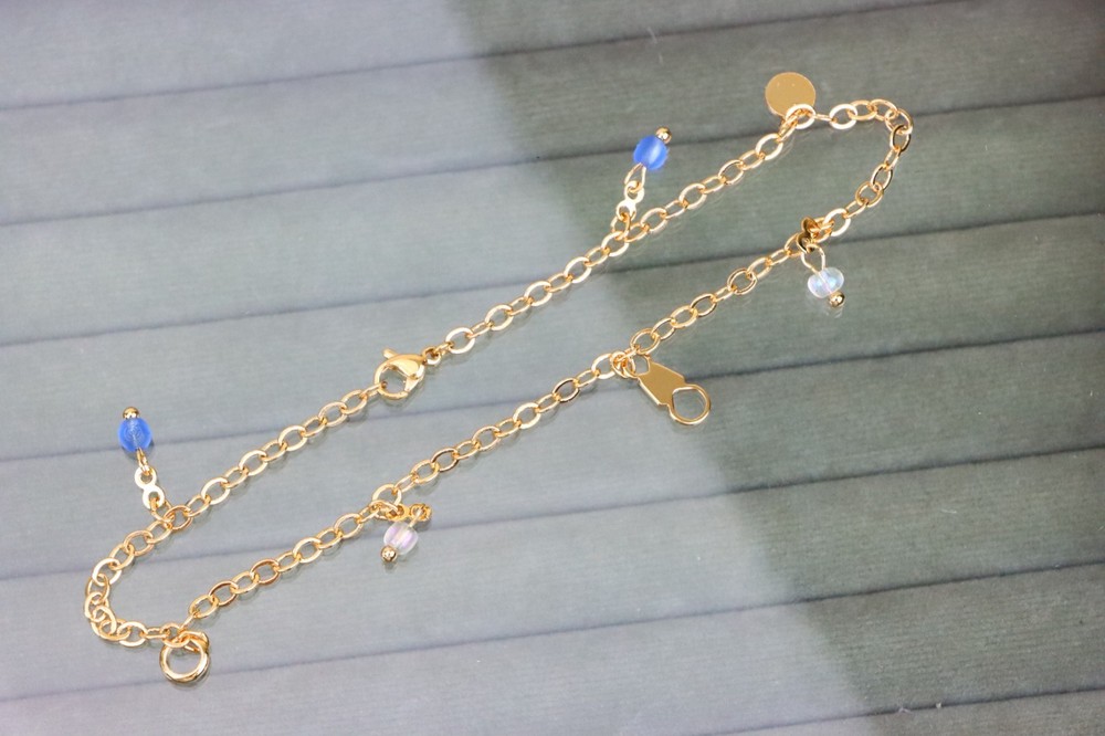 *** Non-Tarnish -- Includes 1-Year No-Tarnish Guarantee *** Chic and Minimal Rose gold anklet featuring dainty blue and white bead charms. ✔ Gold plated over high quality brass ✔ Delicate charm detailing with pearls and blue beads ✔ Lightweight and comfortable for daily wear ✔ Lobster clasp for secure closure ✔ Anklet length: 25 cm (approx. 9.84 inches) ✔ A perfect accessory to enhance any casual or festive look