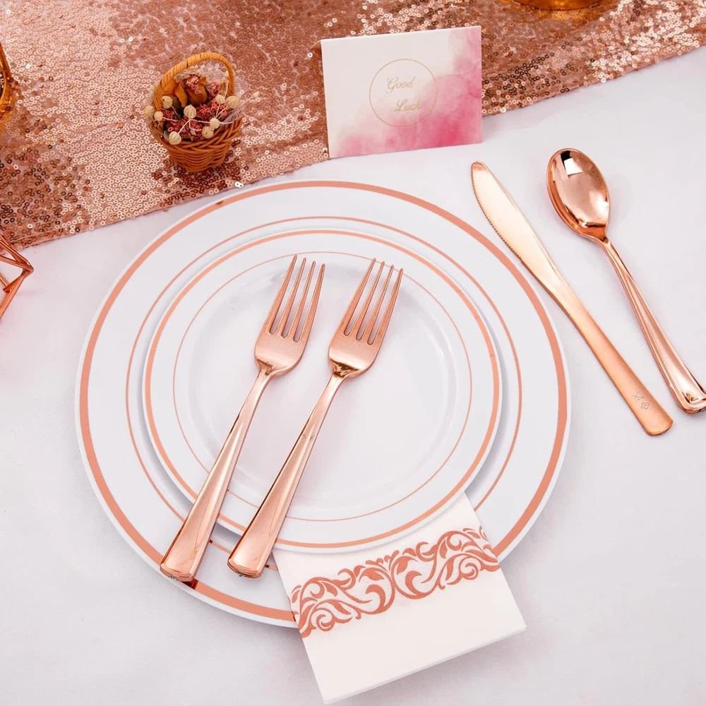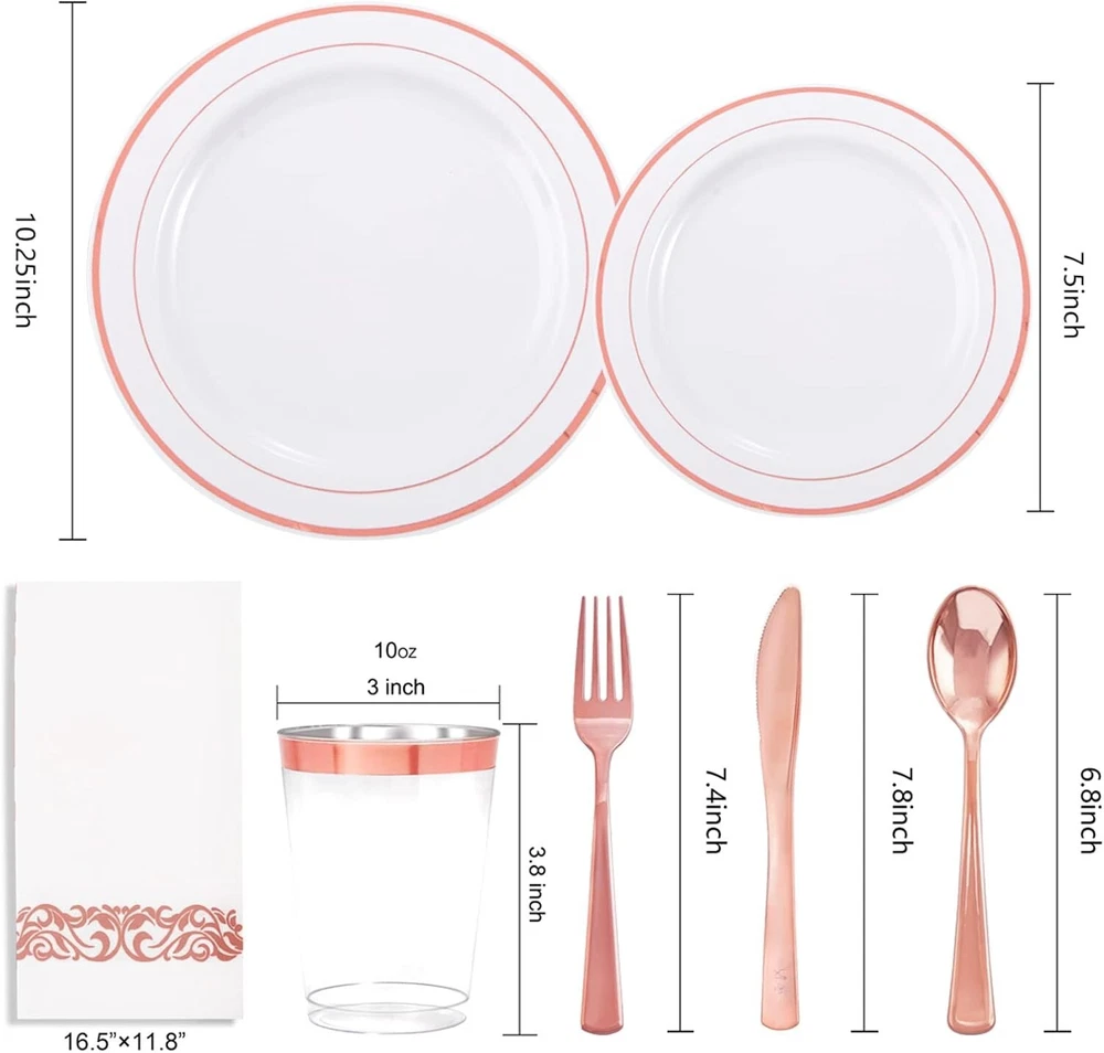 Elegant Rose Gold Disposable Plates and Silverware Set for Weddings & Parties ‹ › ‹ › ‹ › ‹ › ‹ › ‹ › ‹ › ‹ › Elegant Rose Gold Disposable Plates and Silverware Set Transform your gatherings into unforgettable experiences with our exquisite disposable dinnerware designed specifically for weddings, parties, and special occasions. Key Features: Value Pack: Perfect for up to 100 guests, this generous set includes 700 pieces, ensuring no detail is overlooked. Each set comprises: 100 Rose Gold Forks 100 Rose Gold Spoons 100 Rose Gold Knives 100 Dinner Plates (10.25”) 100 Dessert Plates (7.5”) 100 Clear Rose Gold Cups (10oz) 100 Paper Napkins Health-Conscious Material: Crafted from BPA-free, non-toxic, food-grade hard plastic, ensuring safety and durability for your culinary creations. Premium Choice: Enjoy the elegance of high-quality, unbreakable dinnerware that holds more food than traditional paper plates, without the hassle of matching tableware. Perfect for Any Occasion: The polished rose gold finish adds a sophisticated touch to formal dinners, weddings, banquets, and intimate gatherings. Ideal for holiday celebrations, picnics, and everyday use, combining practicality with elegance. Why Choose Our Set? Elevate your dining experience with this Elegant Rose Gold Disposable Plates and Silverware Set. Designed to exude sophistication, this all-inclusive package guarantees a seamless and stylish setup for any occasion. Customer Satisfaction: We are committed to your satisfaction. If for any reason you are not delighted with our rose gold and white plates, please reach out to us, and we will address your concerns promptly. Enhance your events with elegance – order your set today! Shipping Free & Fast Shipping - We offer free shipping to most of the USA with a normal delivery time of 3-7 days. However, due to the current situation, additional delivery time (up to 3 weeks) may be required for some items. Alternative Carriers - We may use alternative carriers (e.g. USPS, FedEx, UPS, etc.) to ensure your package arrives safely and on time. Due to the use of multiple carriers, we are unable to provide a tracking number automatically. Handling Time - Orders are processed and shipped within 1-2 business days of receiving cleared payment. Shipping Restrictions - Shipping to Alaska, Hawaii, Puerto Rico, Guam, and other US territories may incur shipping charges or delivery restrictions. Please contact us before ordering, or your order can be refunded/cancelled. State Restrictions - There may be restrictions based on your state of purchase. For example, certain items may not be shipped to California due to state regulations. Contact for Tracking Updates - If you require tracking updates or have any concerns about the delivery of your order, please feel free to contact us, and we will be happy to assist you. Return 30-Day Hassle-Free Returns - We want you to be completely satisfied with your purchase. If you are not, you can return the item within 30 days of receiving it for a full refund or exchange. Easy Return Process - To start a return, simply contact us and we will provide you with a prepaid return shipping label and detailed instructions. Restocking Fee - There are no restocking fees for returns. However, the buyer is responsible for return shipping costs if the return is not due to a seller's error. Refund Processing Time - Refunds will be processed within 5 business days of receiving the returned item in its original condition. Payment We accept all major credit cards, PayPal, and Apple Pay for your convenience. Your payment information is secure and encrypted to ensure a safe and seamless transaction. Please complete your payment within 3 days of purchase to avoid any delays in shipping. Feedback Your feedback is extremely important to us. We strive to provide the best products and customer service possible. If you are satisfied with your purchase, please take a moment to leave us a positive review. If you have any concerns or issues with your order, please contact us before leaving negative feedback. We are committed to resolving any problems and ensuring your satisfaction. Contact Us If you have any questions or concerns, please feel free to reach out to our customer support team. You can contact us through the eBay messaging system. We are available Monday to Friday, 9:00 am to 5:00 pm EST, and we will do our best to respond to your inquiry within 24 hours. Buy it now and enjoy a pleasant shopping experience! UPC: Not Set Unit Quantity: 700 Material: Plastic Theme: Not Set Occasion: All Occasions,Wedding,Party,Birthday,Camping Set Includes: Complete,Cup,Dessert Plate,Dinner Plate,Fork,Knife,Spoon,Napkin Features: Dishwasher Safe,Microwave Safe Character: Not Set Department: Adults Brand: Unbranded Type: Dinner Set Color: Rose Gold Number of Place Settings: 100 Number of Compartments: Not Set Shape: Not Set Pattern: Solid MPN: Not Set Style: Not Set Country/Region of Manufacture: Not Set Character Family: Not Set Year Manufactured: Not Set Finish: Not Set Number of Items in Set: Seven-Piece Plate Diameter: 10.25 in Manufacturer Warranty: Not Set Model: Not Set Unit Type: Unit Original/Reproduction: Not Set