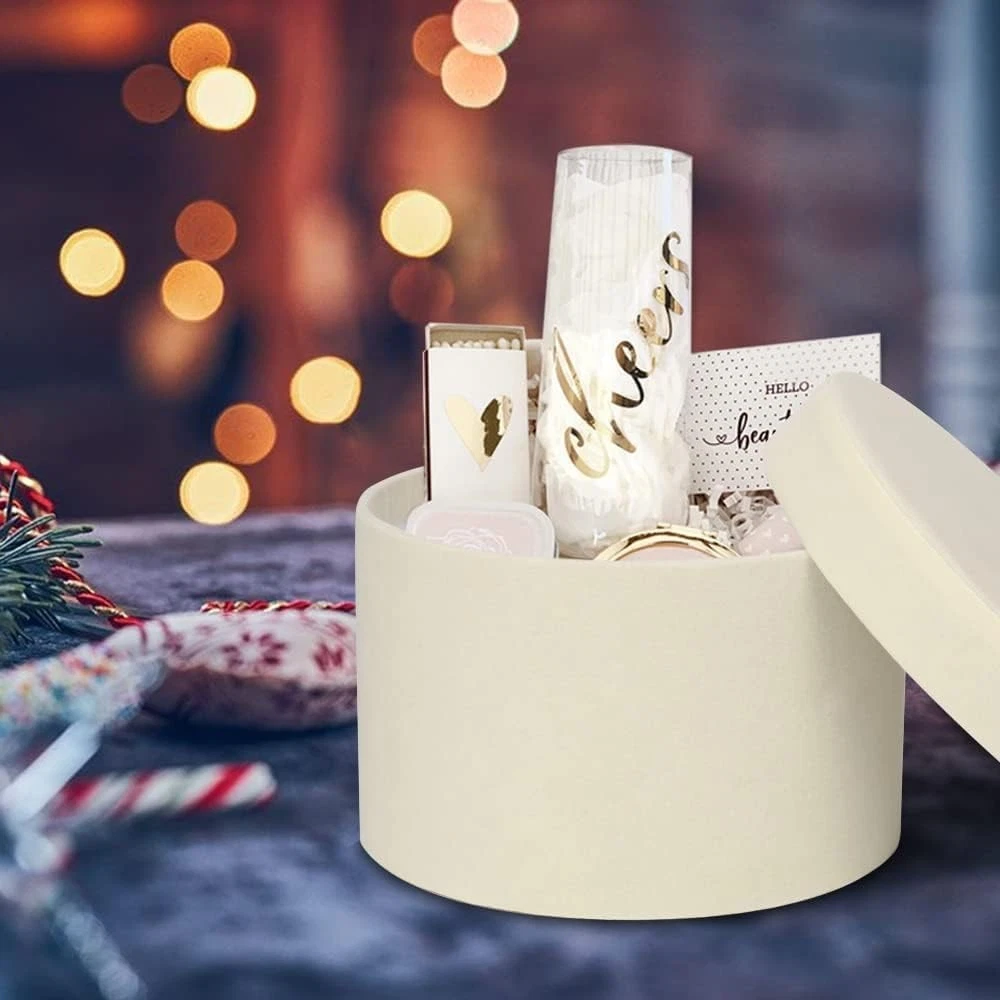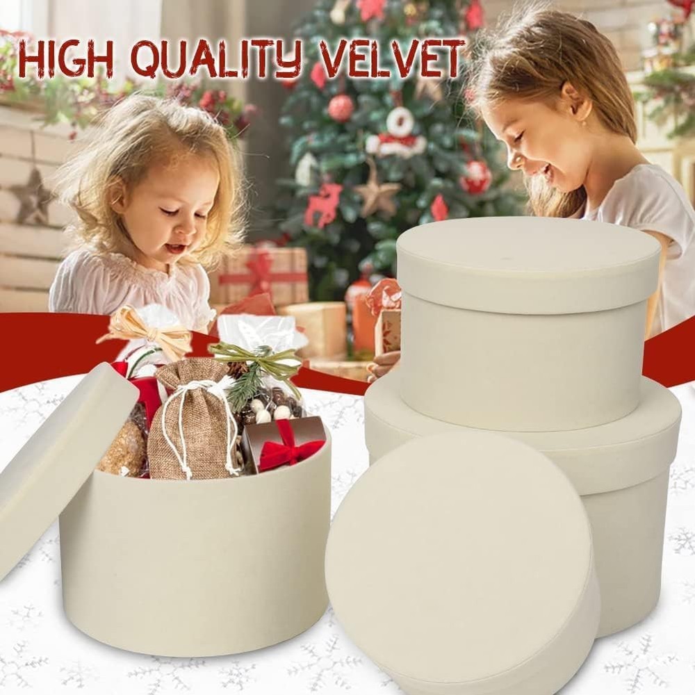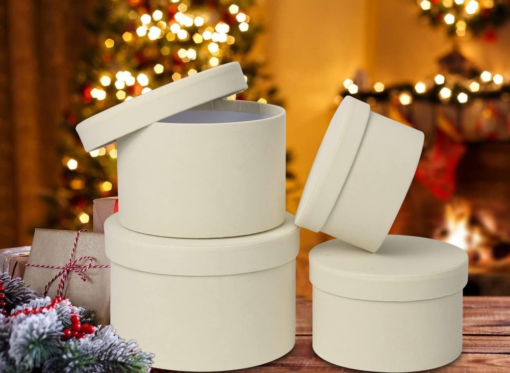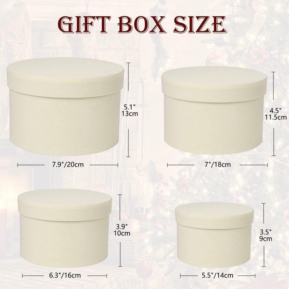 Round White Gift Boxes with Lids for Presents Set of 4 Velvet Nesting Gifts Box for Arrangements Flowers Wedding Birthday Valentines Bridesmaid Christmas Party Anniversary VARIOUS FLORAL BOXES DIMENSIONS: Set of 4 box for gift are designed in various sizes to meet your different packaging needs. You can choose the right goodie boxes according to the size of the item. Extra large gift boxes: 7.9" L * 7.9" W * 5" H; Big gift box: 7" L * 7" W * 4.5" H; Medium gift boxes: 6.5" L * 6.5" W *4" H; Small boxes for gifts: 5.5" L * 5.5" W * 3.5" H; PREMIUM MATERIAL: Our nesting cardboard suede gift boxes with lids inner is made of high-quality paperboard, double thick and environmentally, empty gift box are strong and reliable, reusable. The outer surface of the round boxes for flowers are made of suede, with a more luxurious sense of appearance, makes more classy. can be cleaned easily, you just need to wipe the surface gently with a dry cloth DELICATE CIRCLE GIFT BOXES: Round Gift box for arrangements are roomy and can be used to store a variety of items, it can hold presents like some foods, hankies, scarves, clothing, souvenirs, cosmetics, gift cards, candles, artificial flowers, jewelry, perfume and watches and more. You can tie with ribbons or twine to DIY your unique round gift box or fill some colorful shredded crinkle paple into it, put some thought into making your gift box a unique gift for the people who you like PERFECT MULTIPURPOSE BOX: No assembly required, these decorative round cardboard boxes are ideal choice for gift giving, retail product presentation, giveaways, packaging items. These gift boxes are suit for bridal, parties, proposals, housewarming gifts, birthday gifts, anniversary gifts, Christmas gifts, thanksgiving gifts, wedding gifts, graduation gifts, business gifts, decorative gift, etc AFTER-SALES GUARANTEE: If you feel our suede round gift box is not fit for your gift or you don't satisfied with our gift box, please contact us, our customer service is available within 24 hours. We provide various colors in different packaging quantities for what you need and we also have different sizes of gift boxes for your options
