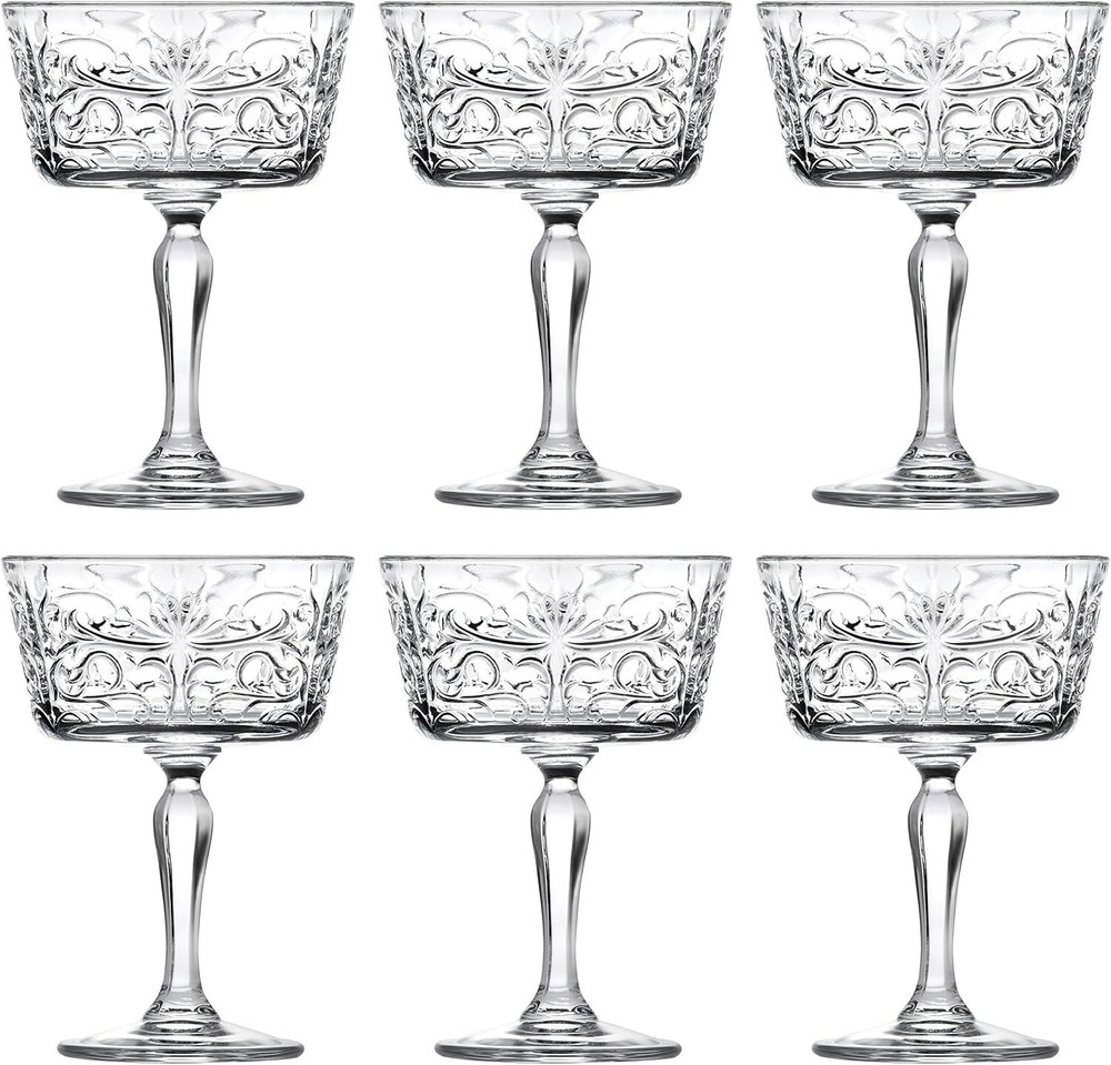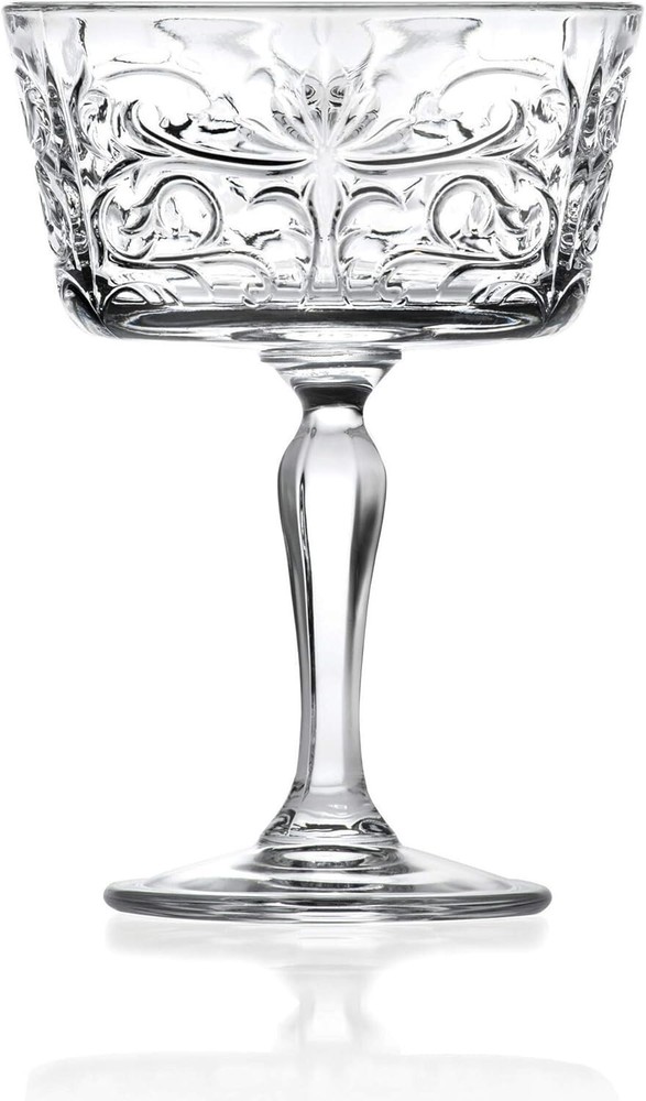 Champagne Glasses - Flute - Saucer - Belle Coupe - Set of 6 Glasses - Glass Crystal - Glass has Tattoo Design -9 oz Made in Europe Superb lead free crystal for outstanding clarity Set of 6 in pretty box " H x " D Dishwasher safe for added convenience Makes a perfect gift for someone that appreciates quality, or for personal use. Inc. has been the leader in the crystal and glass industry for over two decades. Our sterling reputation of providing the consumer with the highest quality merchandise with the most cost effective pricing has been ongoing. This set of 6 Flute glasses are a part of the Tabletop Collection that has been an all time favorite. Artistically designed to coordinate beautifully with any tabletop decor. Rest assured this set will make a statement of elegance, thereby changing the ambiance from the simplest affair to an upscale event.