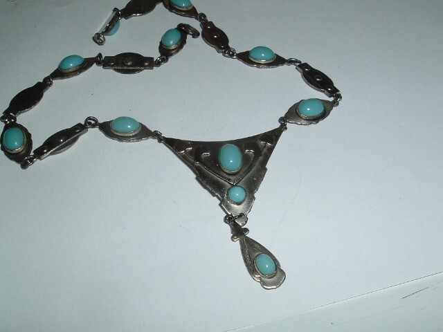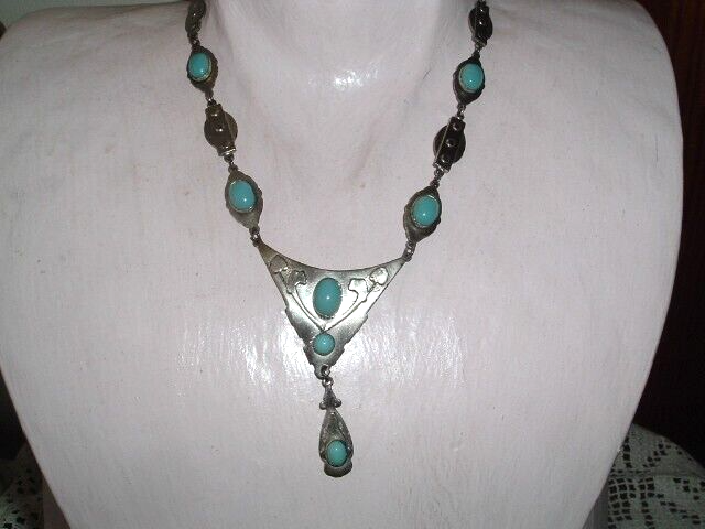 From a Chicago estate sale, an arts and crafts silver (possibly sterling) necklace with oval, bezel set, turquoise blue glass stones. Measures 16" long, beautiful on and condition is excellent, circa 1920. Seller will pay postage and postal insurance. We will ship in jeweler's gift box, perfect gift for MOTHERS DAY which is coming soon.