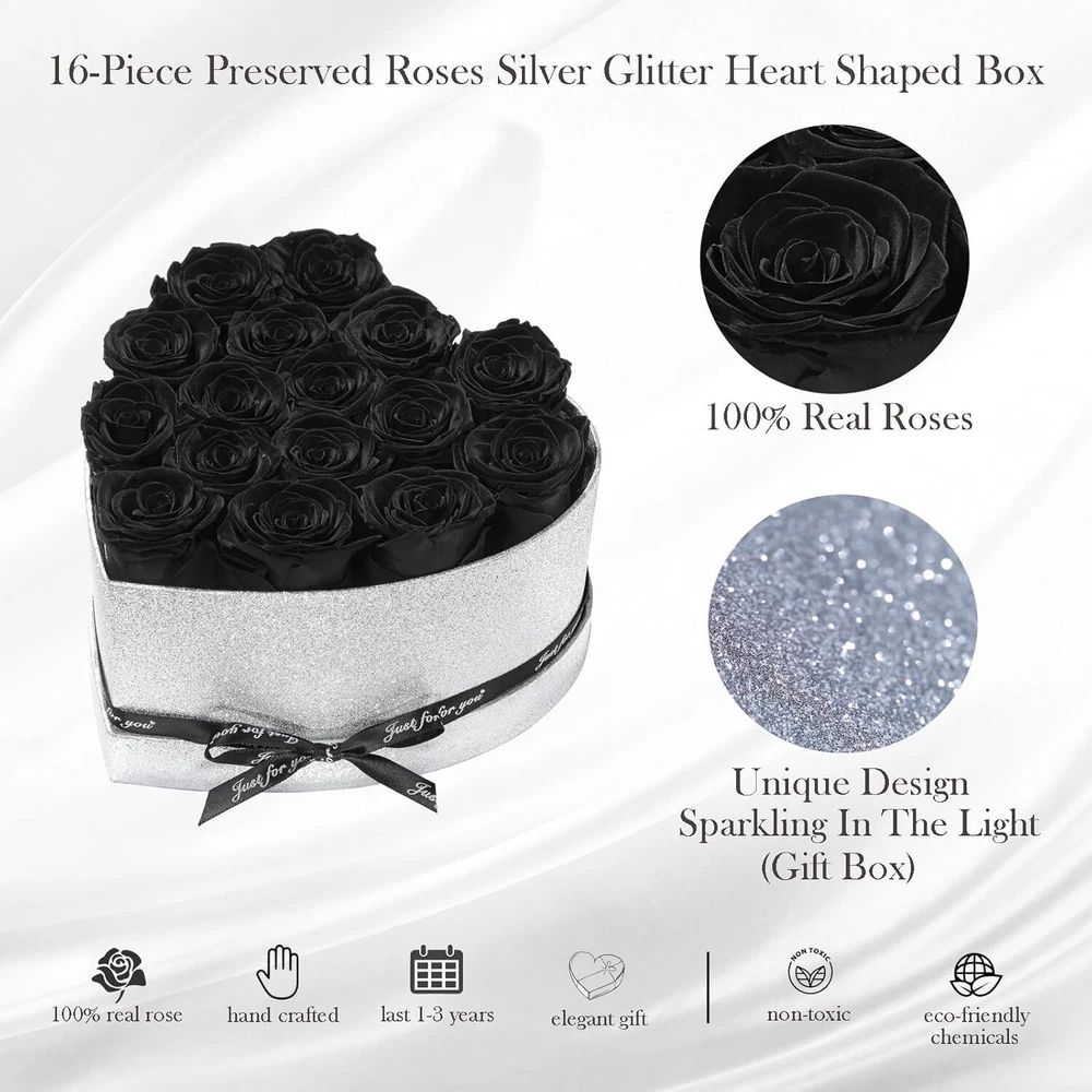 Elegant Silver Glitter Heart Box with 16 Forever Roses - Romantic Gift Idea