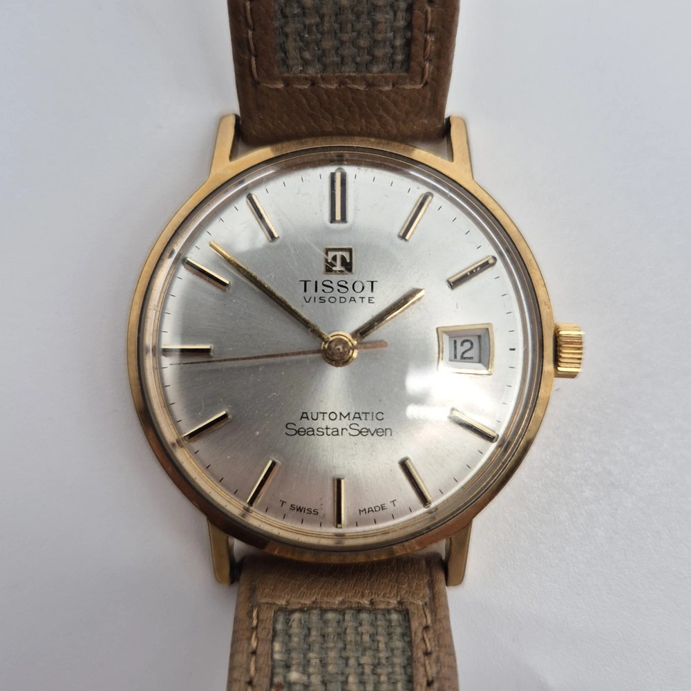 Diese Tissot Visodate Automatic "Seastar Seven" vereint ein zeitloses Design mit Schweizer Präzision. Das silberne Zifferblatt mit goldfarbenen Akzenten wird durch ein robustes Gehäuse in vergoldetem Edelstahl und ein stilvolles, braunes Lederarmband ergänzt. Ein ideales Sammlerstück für Liebhaber klassischer Uhren. Details: Marke: Tissot Artikelnummer: FES0332 Zustand: Gebraucht Material: Vergoldeter Edelstahl Herkunft: Schweiz Funktionen: Automatikwerk, Datumsanzeige Gewicht: Ca. 75 g Besondere Merkmale: Klassisches Design mit vergoldeten Akzenten Automatikwerk für zuverlässige Präzision Wasserfestes Gehäuse mit graviertem Boden