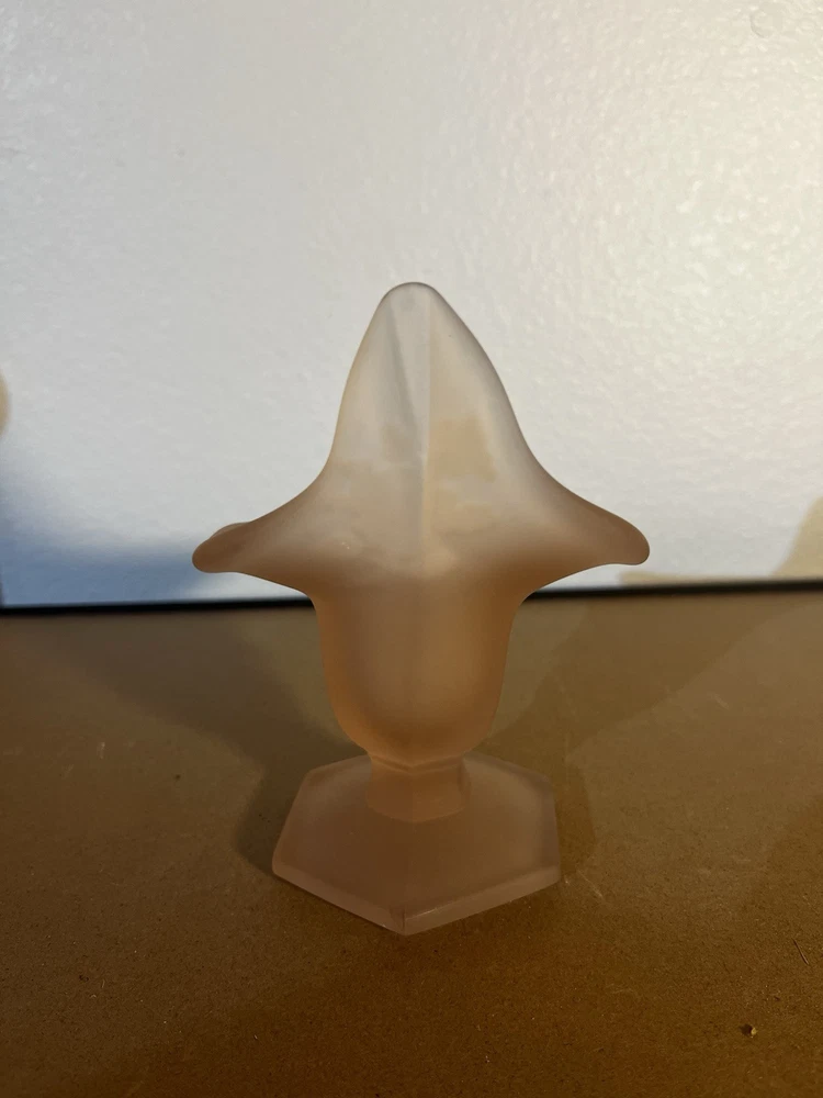 This is a vintage Westmoreland Art Deco vase originating from America. It features a pink frosted glass Jack in Pulpit design with a rose motif. The vase is 5 1/4 inches tall and hand-blown, showcasing intricate floral details. This elegant piece reflects a miniature theme and was produced in the 1970s, showcasing the exquisite artistry of Westmoreland's art glass production.