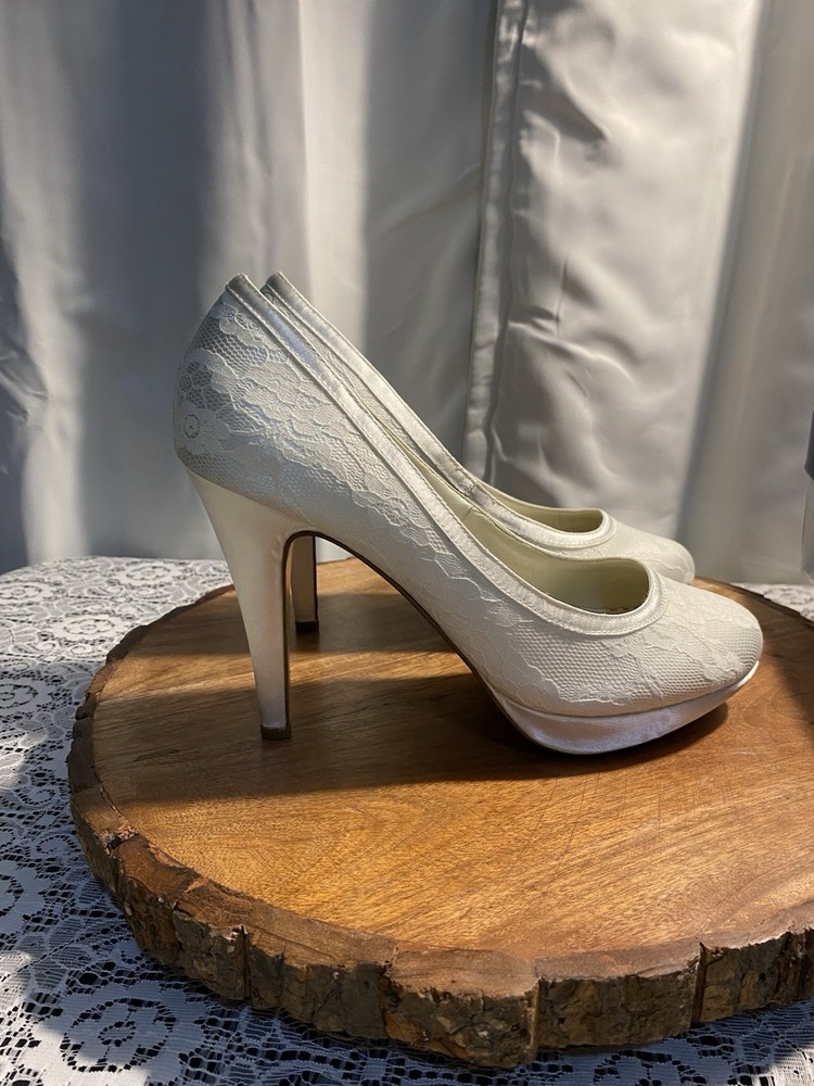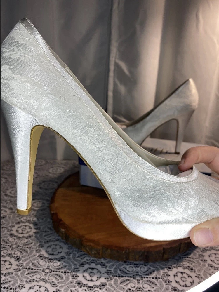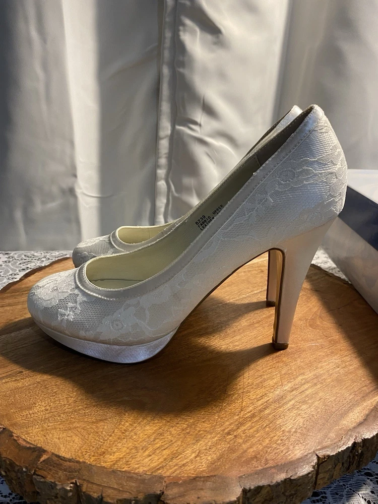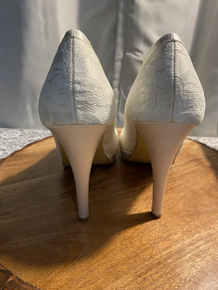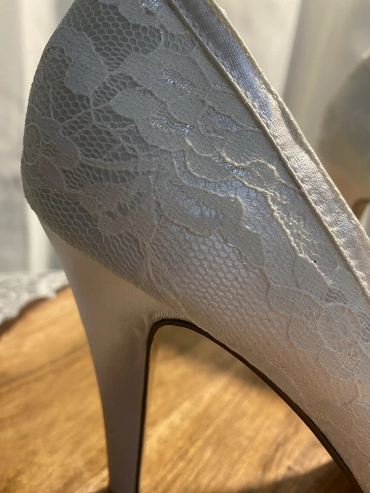 Elegant White Brigette Lace High Heels These white heels boast a classic lace pump style and a high, slender heel. Their minimalist design and smooth finish make them a versatile addition to any wardrobe, perfect for elevating your look with a touch of elegance.
