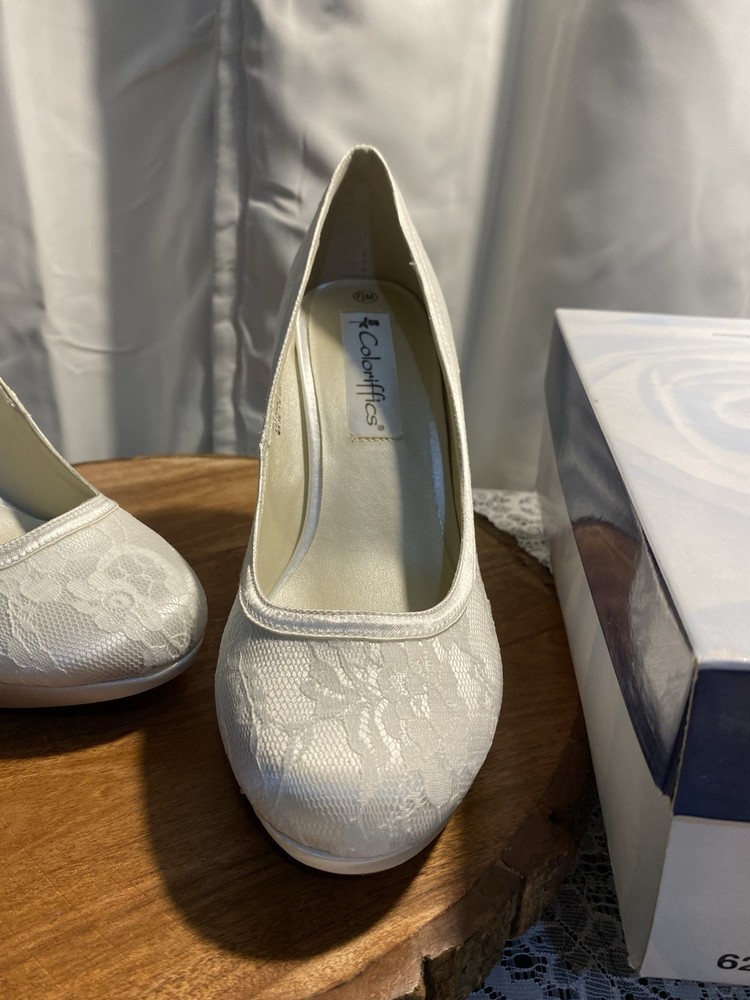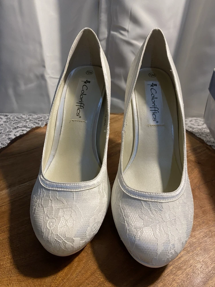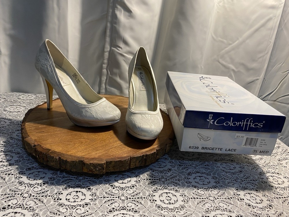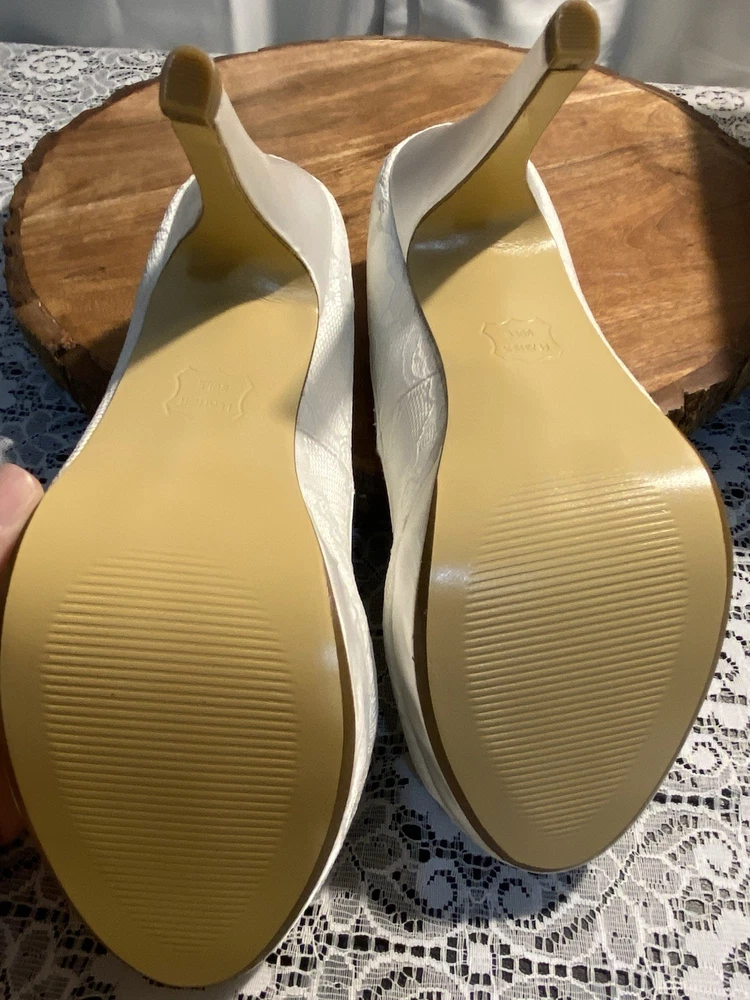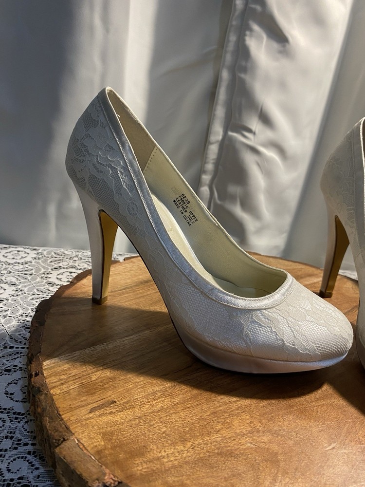 Elegant White Brigette Lace High Heels These white heels boast a classic lace pump style and a high, slender heel. Their minimalist design and smooth finish make them a versatile addition to any wardrobe, perfect for elevating your look with a touch of elegance.