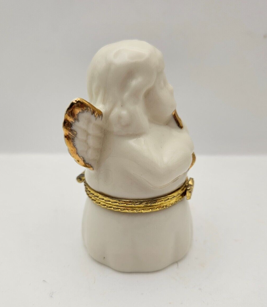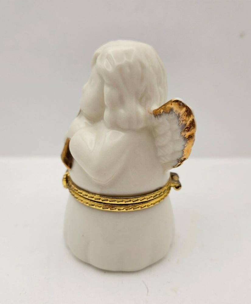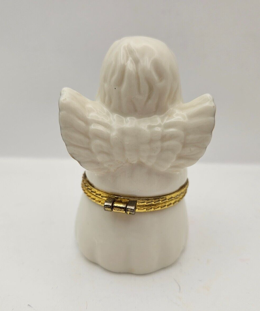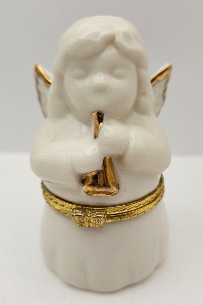 Christmas Angel White Porcelain Gold Trim Hinged Jewelry Trinket Keepsake Box - makers stamp on bottom JCM - foam insert to protect keepsakes, earrings, rings, charms - white porcelain angel with gold trimmed wings and horn - no chips or cracks - measures approx 3.25" tall x 1.75" x 1.75"