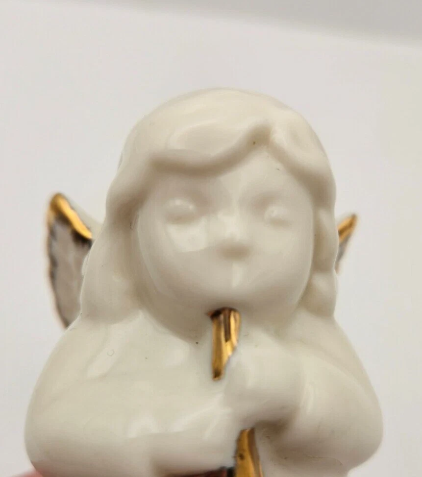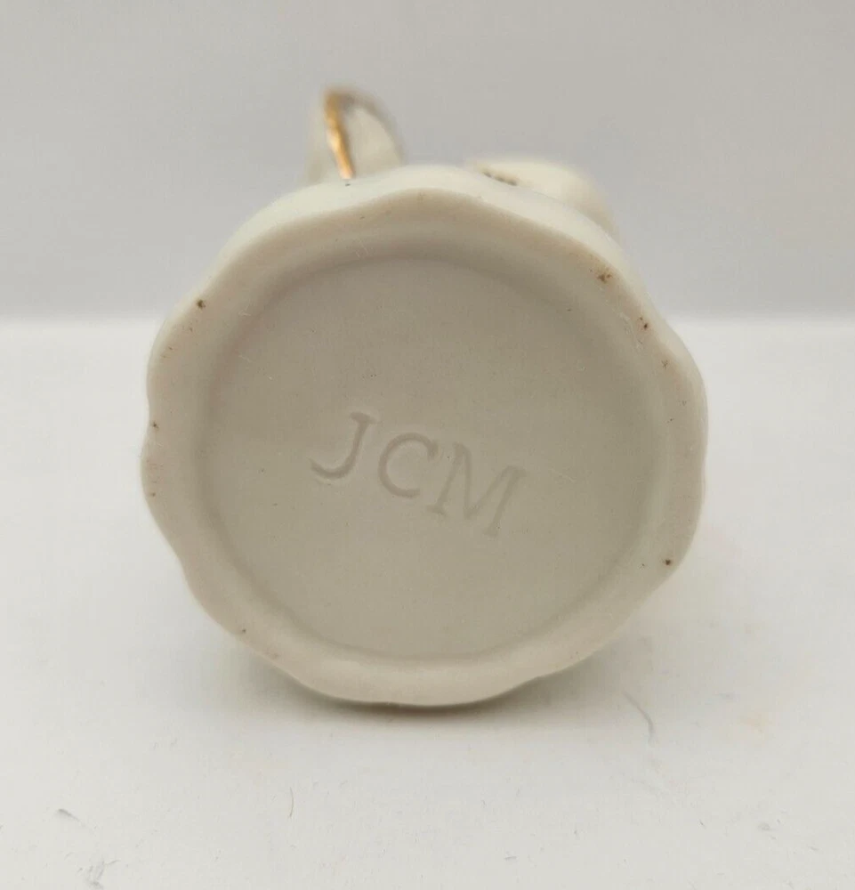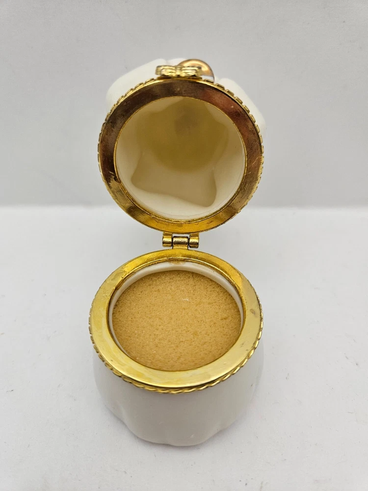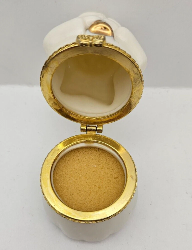 Christmas Angel White Porcelain Gold Trim Hinged Jewelry Trinket Keepsake Box - makers stamp on bottom JCM - foam insert to protect keepsakes, earrings, rings, charms - white porcelain angel with gold trimmed wings and horn - no chips or cracks - measures approx 3.25" tall x 1.75" x 1.75"