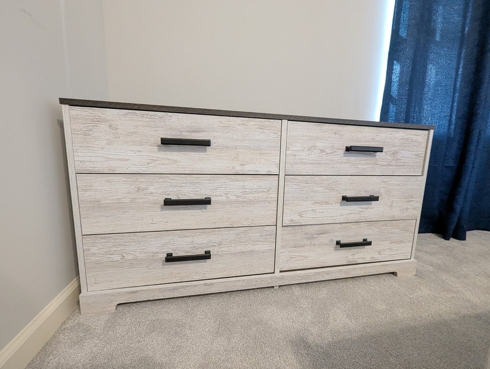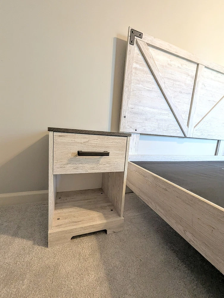 White wash Bedroom Set- •Dresser: length 52 and 3/4in, height 26 and 1/4in, width 16in •Queen Size Bed: length 7ft, height 52 and 1/2in, width 63 and 1/2in •Nightstands: length 16in, height 22 1/4in, width 16in One nightstand has some mild scratches (shown in picture)