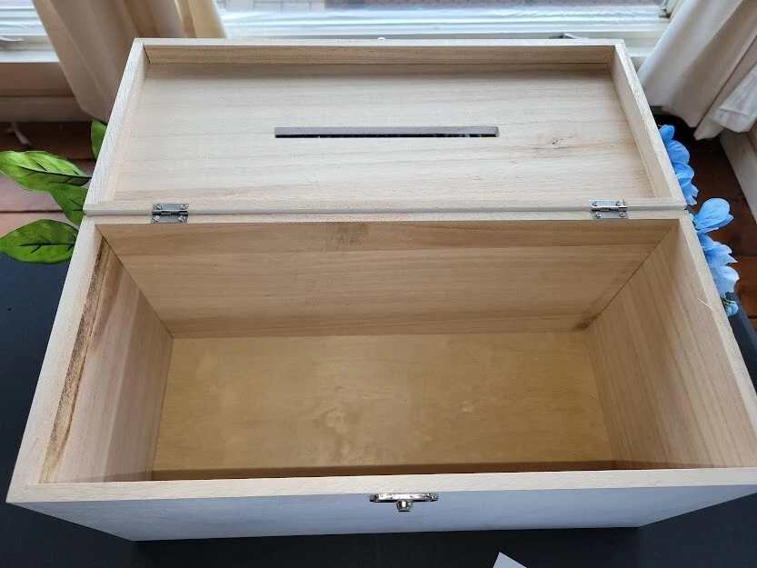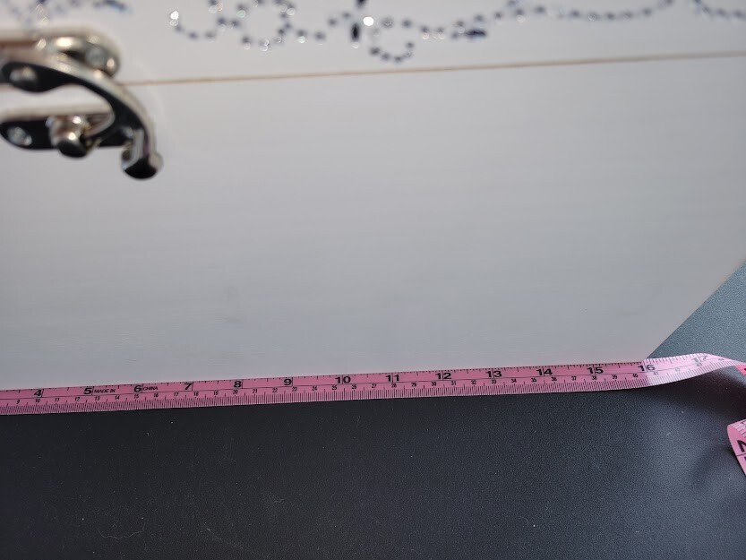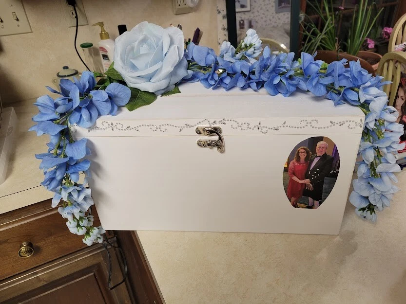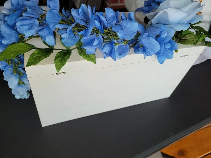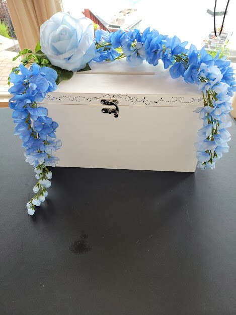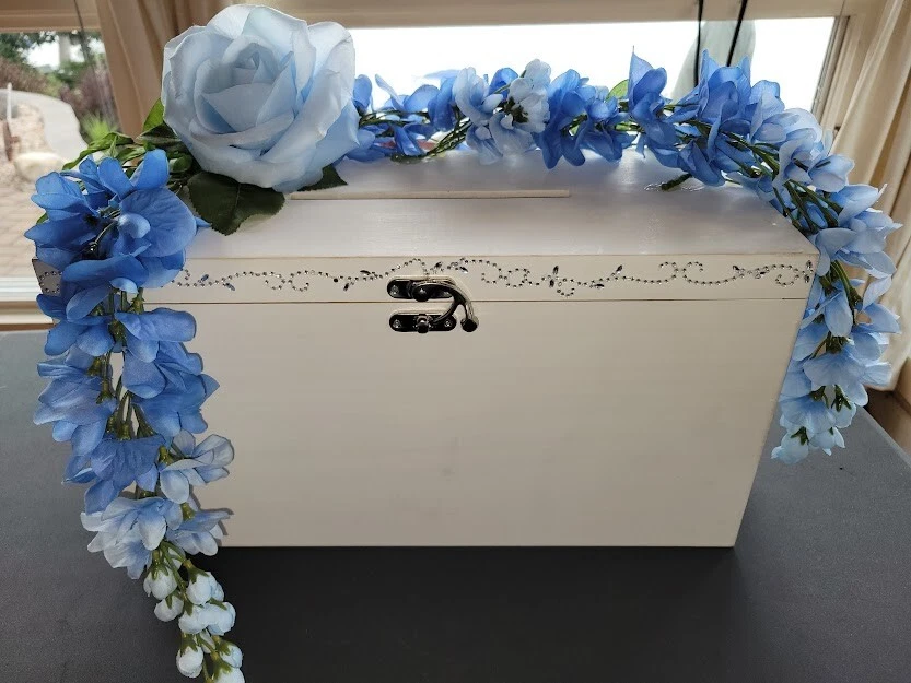 Have a beautiful place for all your gift cards at your wedding or shower. This is a large wooden rectangle shaped box. It measures approx 16" wide. It has pretty crystals applied along the front. There is a latch closure, no key required. I have attached lovely blue flowers to the top that hang over the sides. You can adjust as you like. Only used once at my own wedding, a month ago. Worked great. I had applied a photo to the front when we used it. Please see photos. This will meet your requirements of something old and something blue. Don't pay those high prices at the stores. Smoke and pet free home.
