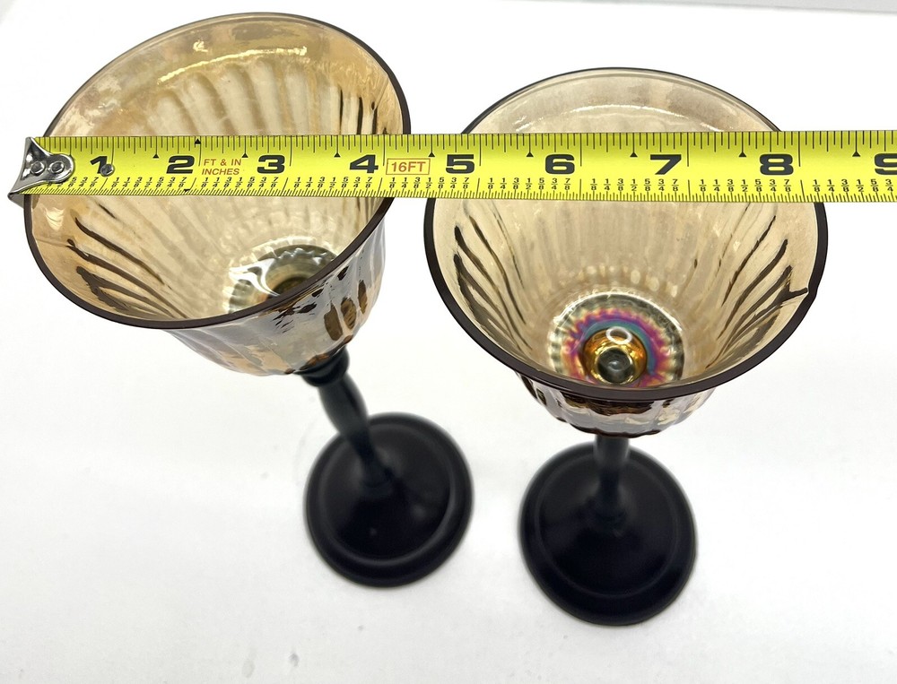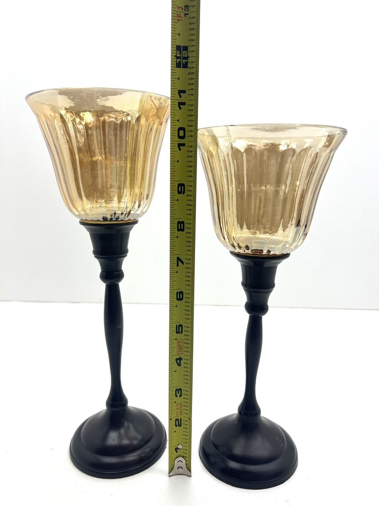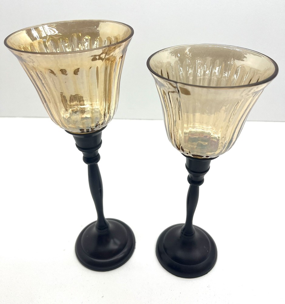 This is a set of two beautiful candle holders made of glass and metal. They are perfect for adding a touch of elegance to any home decor. The holders are designed to hold candles and can be used as decorative pieces for any room in the house. The combination of glass and metal provides a sturdy and durable structure for the candle holders.