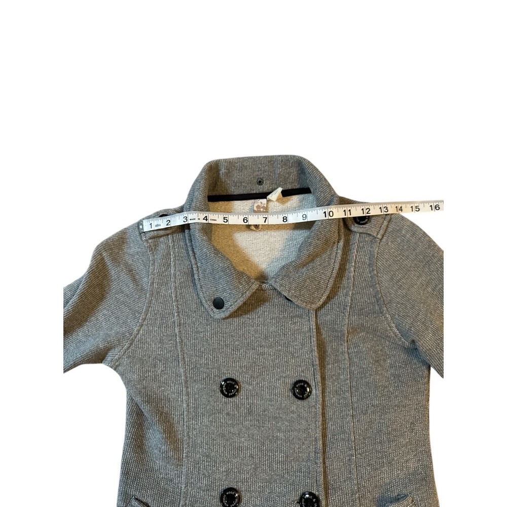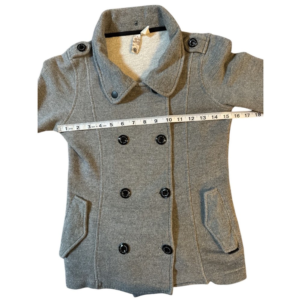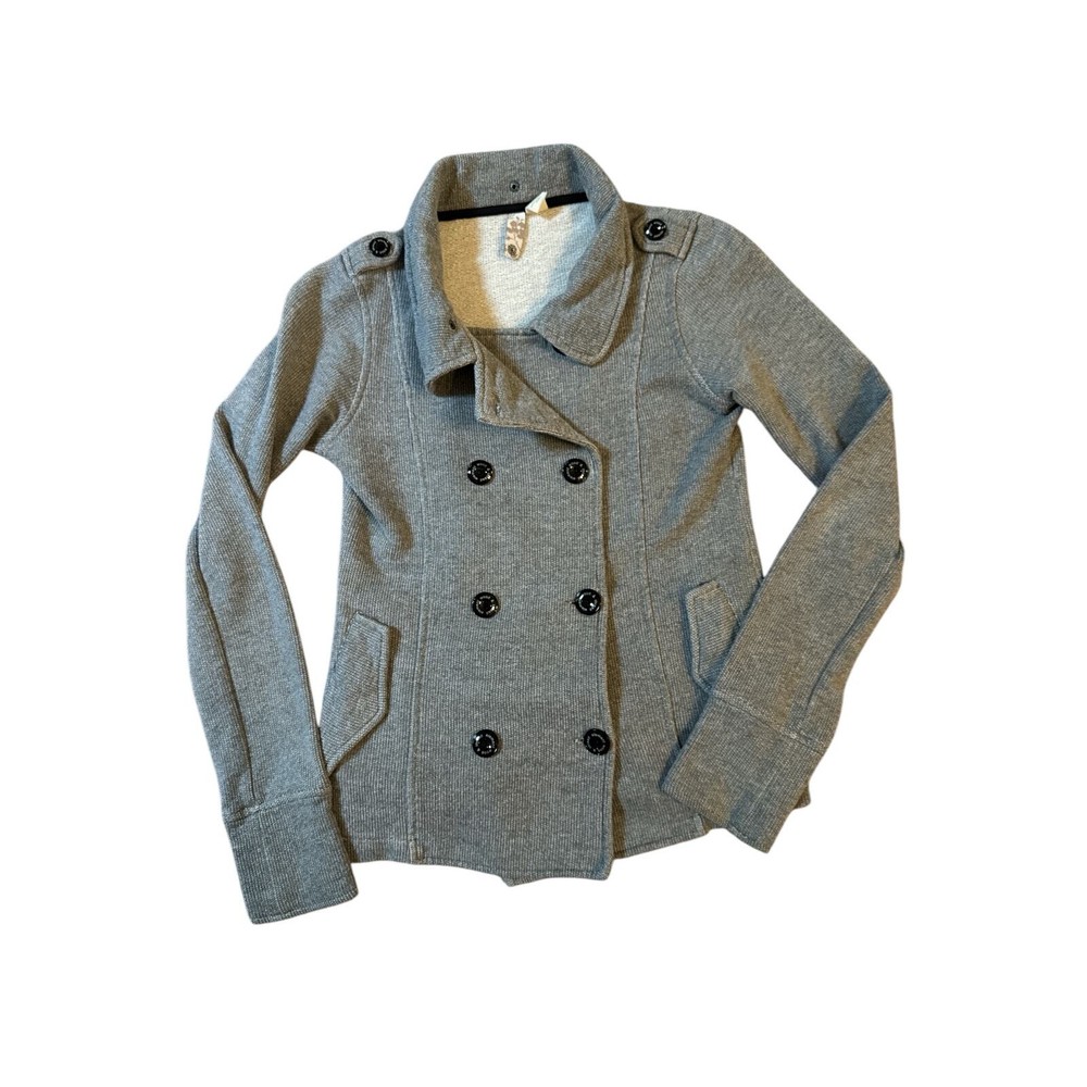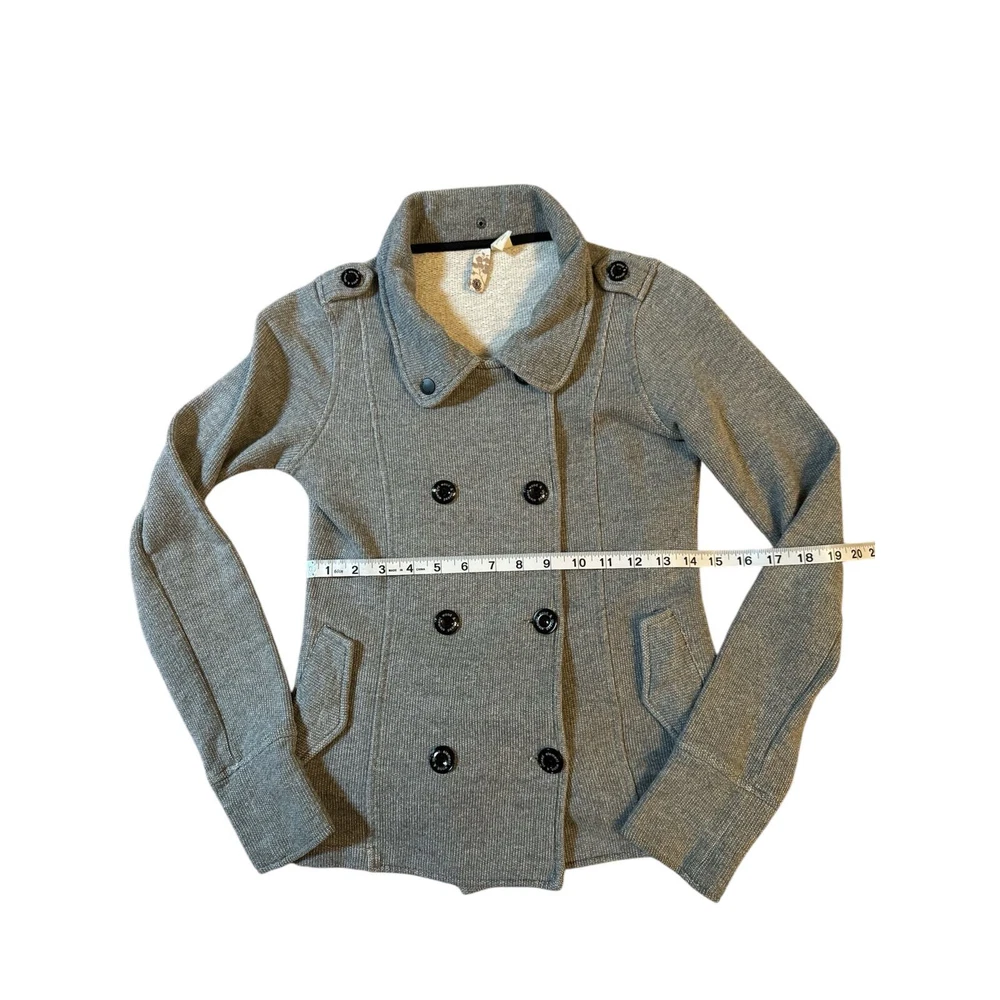 Element Wood & Thread double breasted soft gray peacoat Soft with stretch Button closure Double breasted Button detail on shoulders Light weight Similar to a soft sweatshirt material Measurements in photos