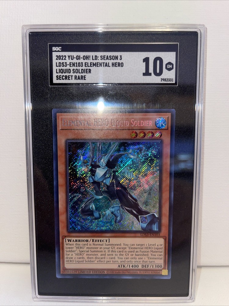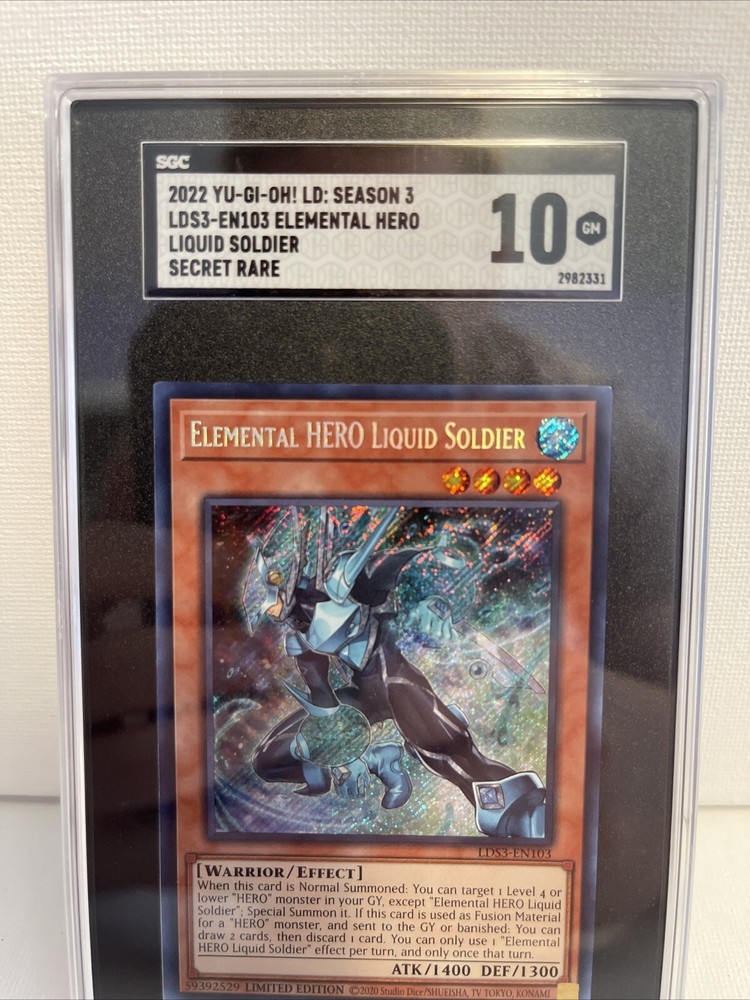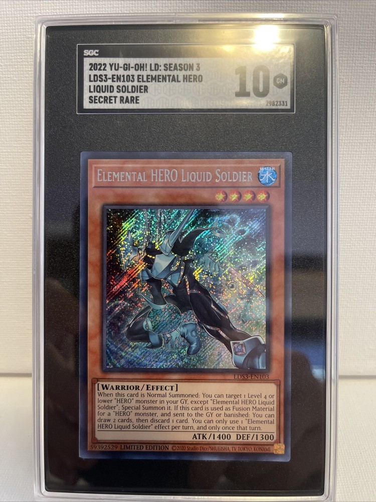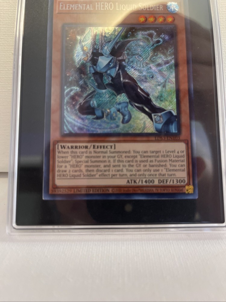 Set:Legendary Duelists: Season 3Card Number:LDS3-EN103Card Text:When this card is Normal Summoned: You can target 1 Level 4 or lower "HERO" monster in your GY, except "Elemental HERO Liquid Soldier"; Special Summon it. If this card is used as Fusion Material for a "HERO" monster, and sent to the GY or banished: You can draw 2 cards, then discard 1 card. You can only use 1 "Elemental HERO Liquid Soldier" effect per turn, and only once that turn.Level:4Card Name:Elemental HERO Liquid SoldierManufacturer:KonamiCard Type:EffectAttack/Power:1400brand:KonamiGame:Yu-Gi-Oh! TCGAttribute/MTG:Color:WaterDefense/Toughness:1300Rarity:Secret RareAdditional Description:Elemental HERO Liquid SoldierFeatures:Limited EditionLanguage:EnglishCreature/Monster Type:Warrior