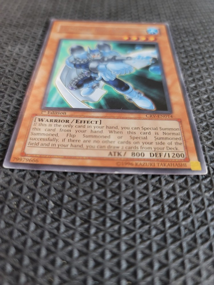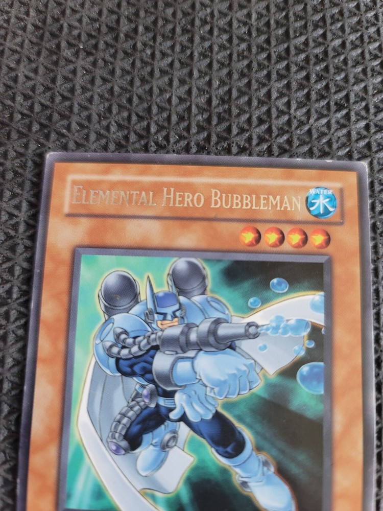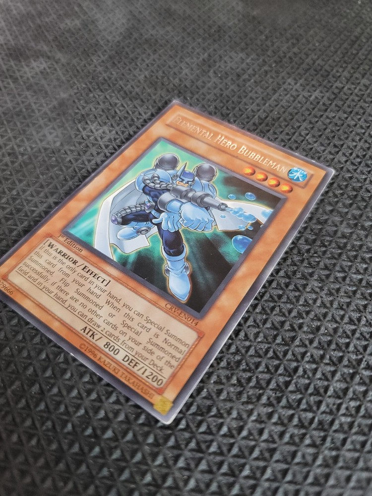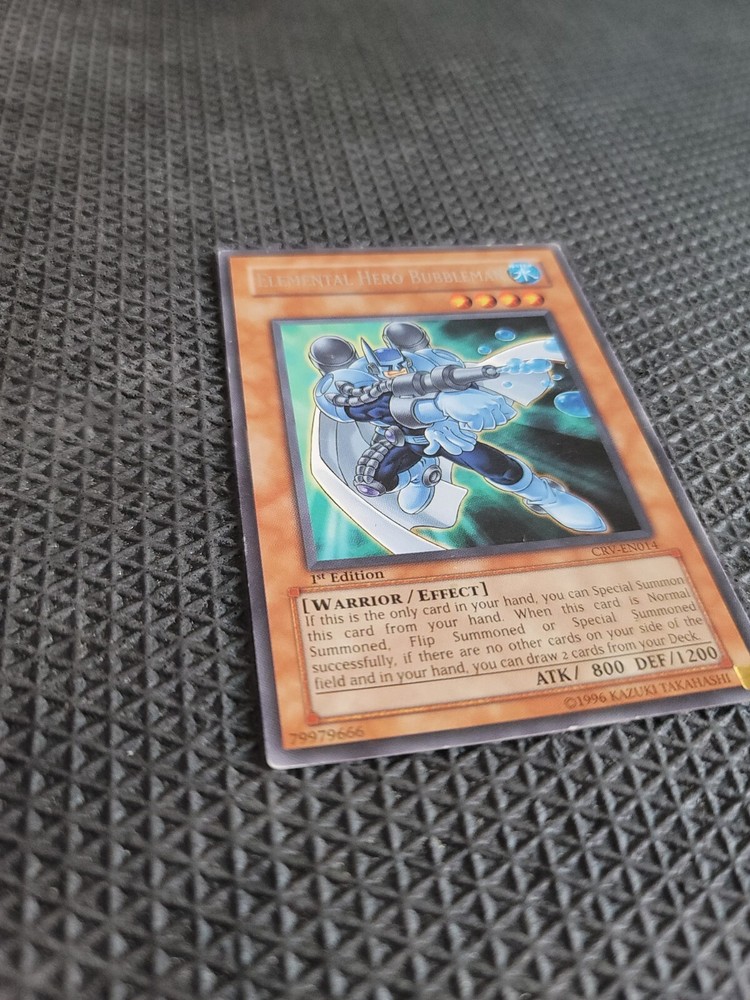 Creature/Monster Type:WarriorRarity:RareFeatures:1st EditionLevel:3Game:Yu-Gi-Oh! TCGAttribute/MTG:Color:WaterCard Type:EffectDefense/Toughness:1200Card Text:If this is the only card in your hand, you can Special Summon this card from your hand. When this card is Normal Summoned, Flip Summoned or Special Summoned successfully, if there are no other cards on your side of the field or in your hand, you can draw 2 cards from your Deck.Card Name:Elemental HERO BubblemanLanguage:EnglishCard Number:CRV-EN014Manufacturer:KonamiAttack/Power:800brand:KonamiSet:Cybernetic RevolutionAdditional Description:Elemental Hero Bubbleman