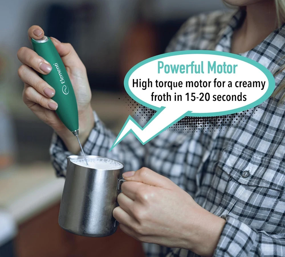 Elementi Milk Frother Handheld Double Whisk - Matcha & Drink Emerald Product Details Brand: Elementi Special Feature: Compact Design, Double Whisk Color: Emerald Material: Stainless Steel Product Dimensions: 1.97"W x 9.06"H Recommended Uses For Product: Residential Model Name: MF-NOSTNDDBLWSK-PRT Included Components: Stainless Steel Whisk Item Weight: 3.04 ounces Product Care Instructions: Hand Wash Only Style: Batteries Not Included Power Source: Corded Electric Manufacturer: Elementi Item model number: MF-NOSTNDDBLWSK-PRT PERFECT FOAM EVERY TIME: With the specially crafted double whisk, this handheld frother creates the ideal foam for your favorite beverages. WORKS IN UNDER 30 SECONDS: Enjoy rich and creamy froth in seconds with handheld milk frother. This compact and portable device is easy to use and clean, making it perfect for everyday use. ELEVATE YOUR COFFEE EXPERIENCE: With our electric whisk for coffee, you can enjoy café quality drinks in the comfort of your home. Easily craft cappuccinos, macchiatos and more with this convenient and versatile handheld frother. MORE THAN COFFEE: Make matcha tea, powder mixes, protein powder, and more. We’ve spent hours testing and honing to ensure you can use the Elementi frother for nearly anything, including a quick mix of mixed greens for a nutritious drink.