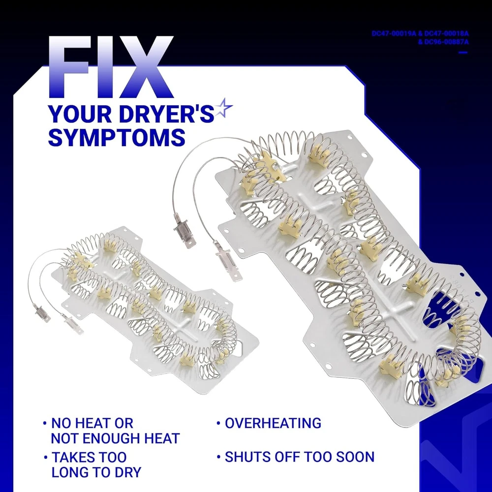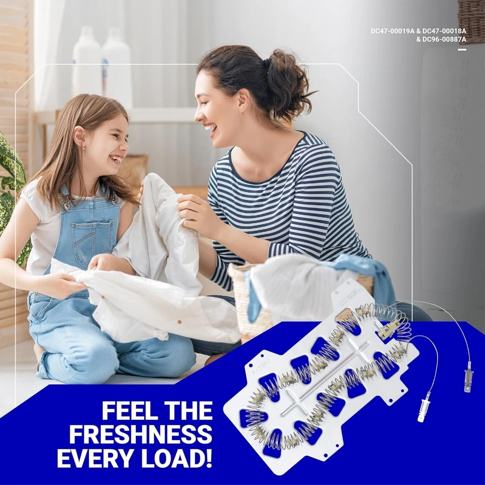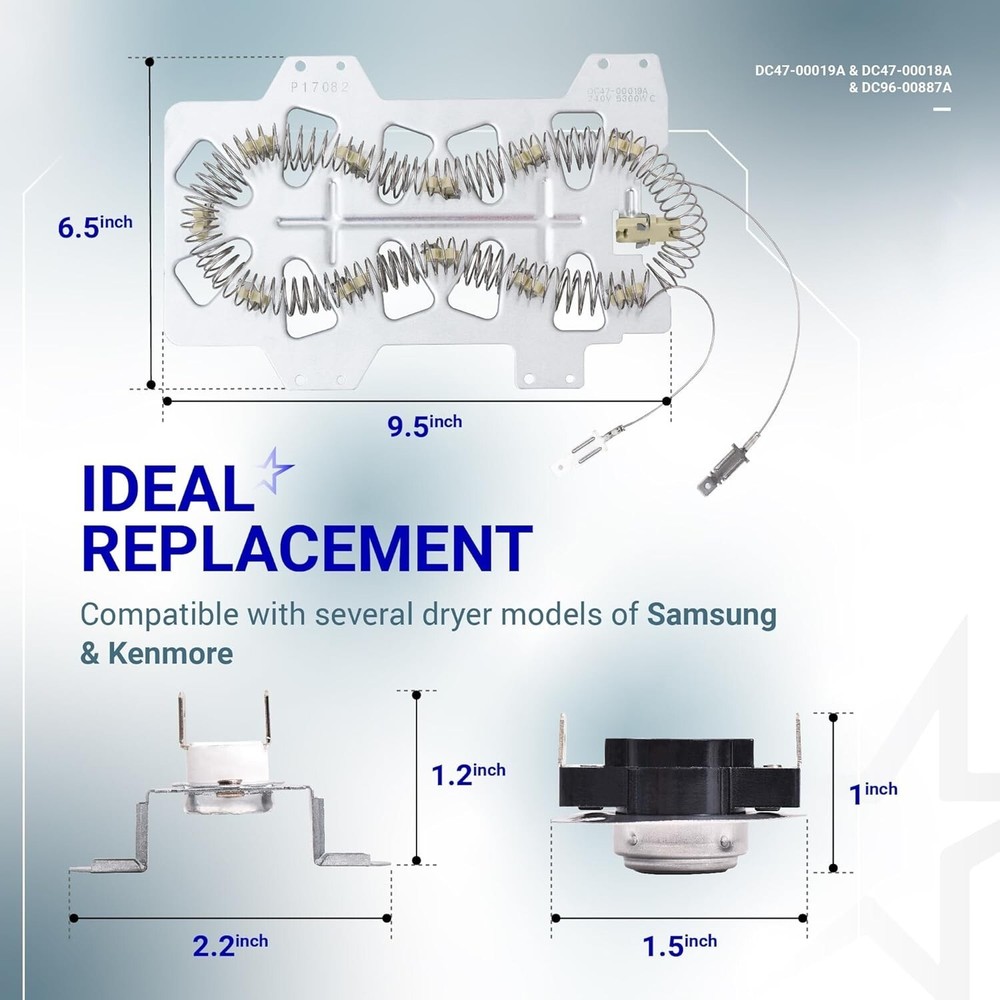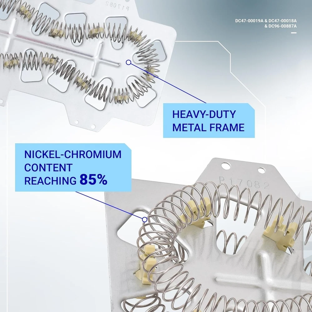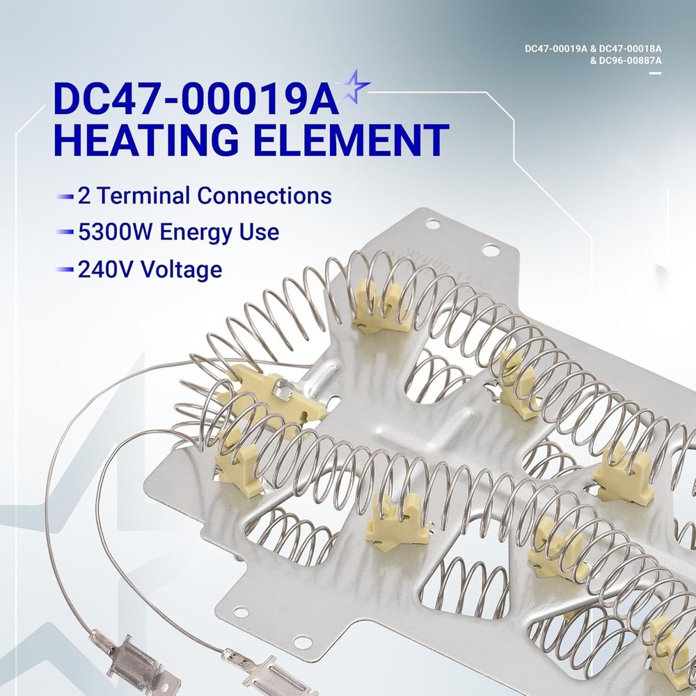 Elemento Calefactor Para Secadora Resistente Al Calor Y A La Abrasión 240V NEW. KIT COMPLETO: incluye 1 elemento calefactor para secadora DC47-00019A (5300 vatios, 240 voltios), 1 termostato para secadora DC47-00018A, 1 fusible térmico para secadora DC96-00887A con soporte. Comprueba el número de modelo con atención antes de realizar el pedido. Si no estás seguro de la compatibilidad, envíanos el número de modelo de tu secadora y te ayudaremos a confirmar si es compatible o no. FÁCIL DE INSTALAR: compatible con la mayoría de las marcas más conocidas (Samsung, Kenmore). Compatible con los modelos: DV42H5000EW/A3, DV45H7000EW/A2, DV48H7400EW/A2, DV42H5200EP/A3, DV40J3000EW/A2, DV42H5200EW/A3, DV50M7450W. DV50M7450W/A3, DV448AEP/XAA, DV5451AEW/XAA, DV42H5000ES, DV331AER/XAA, DV5471AEP/XAA, DV56H9000EP/A2, DV448AEW/XAA, DV331AEW/XAA, DV419AEW/XAA, DV50F9A6EVW/A2, DV50F9A7EVP/A2, DV361EWBEWR/A3, DV393ETPAWR/A1, DV407AEW/XAA, DV45H7000EP/A3, etc. NÚMEROS DE PIEZA: ► DC47-00019A reemplaza los números de pieza: AP4201899, PS4205218, 35001247, 35001119, AP4045884, 1185561, AH2038533, EA2038533, PS2038533, ERDC47-00019A ► DC96-00887A reemplaza los números de pieza: PS2038484, AP4207819, DC96-00887C, AP5966894, PS4276292 ► DC47-00018A reemplaza los números de pieza: PS4205217, PS2038383, AP4201898, AP4201899, 35001092 CALIDAD PREMIUM: El NUEVO elemento calefactor para secadora Samsung DC47-00019A MEJORADO está hecho de METAL de alta calidad y contiene bobinas de alambre calefactor que tienen un contenido de níquel-cromo que alcanza el 85% para generar calor de manera efectiva en su secadora. Cumple perfectamente con los estándares OEM e incluso mejor con bobinas un 25% más largas que mejoran la resistencia al calor y la eficiencia hasta un 50% que las comunes: garantiza un rendimiento alto y duradero