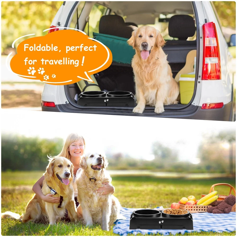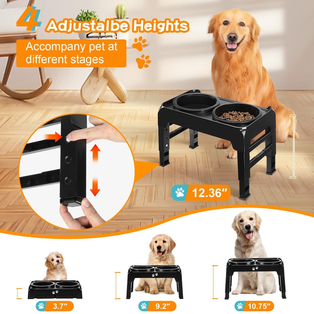 Reduce Eating Burden: The elevated dog bowl stand comes in four different heights: 3.7", 9.2", 10.75", 12.36".Primarily suitable for most dogs of medium to large size(except for extra small or extra large dogs). If you need to adjust it, just open the stand, press and hold the white button and then stretch it to the desired height.It helps protect your pet's neck and spine and reduces the burden on joints. Scientific height design for better food digestion. Slow Down Eating: The slow dog food bowl in the set helps your dog to slow down eating, digest food better, and maintain oral and gastrointestinal health.The large 45oz capacity slow feeder dog bowl eliminates the need for frequent refills and allows your pet to drink enough water.Bowl is easy to clean, just rinse under running water. Non-slip & Eating quiet: The bottom of the raised dog bowl stand is equipped with non-slip feet to avoid slipping and falling while eating or accidental knocking over due to the unstable stand. Protect your floor from damage.Silicone strips on the bowl stand to prevent dog bowls from moving and making noise. Safe & Easy to Clean: Bowls and stand are made of ABS one-piece plastic. Bowls are food-grade materials to safeguard dog's health safe. Foldable & Easy storage: Our dog bowl stand is foldable so it is easy to store. When we don't use it for a while, we can store it away to reduce space. And easy to carry when travelling.We offer a lifetime warranty, please feel free to contact us if you have any questions. 🐕Reduce The Speed of Eating to Promote Digestion & Keep Clean: By combining a tall dog bowl stand with slow feeding dog food bowl and large-capacity dog water bowl to slow down the speed at which your dog eats, it prevents your dog from swallowing air because of rapid gulping and reduces the problem of gas and bloating that your dog will experience as a result. The slow feeder dog bowl is also large enough for your dog to eat and drink a lot. 🐕Upgraded 8" round dog bowls replaced the inconvenient square bowl and to be easier for dogs to get food out, cleaning is a breeze then, and you can always replace the most commonly used round bowls of the same size as you like. 🐕Adjustable Height Dog Food Bowl Stand for Medium & Large Sized Dogs: Say goodbye to bending down! Our elevated dog bowls can be adjusted to 4 different heights: 3.7", 9.2", 10.75", and 12.36", accompany then from puppy to full grown. The raised dog bowls can not only makes it easier and comfortable for dogs to access their food and water, but also prevents dust or floor debris from falling into the bowls, ensuring a clean and healthy dining experience. 🐕Neck and Joint Protection: Our raised dog food bowls not only help the dogs eat more ergonomically, protecting their necks and spines while relieving pressure on their joints, but also promote healthier digestion. This is an essential item, particularly for dogs who tend to vomit while eating, have mobility issues, or suffer from arthritis. The rounded corners of the bowl stand also help prevent accidental bumps or injuries. (Much safe and healthy dog bowls for medium large dogs. 🐕No Installation & Folds Up Nice for Traveling: The detachable design and foldable legs make it easy to pack and much space-saving, Ideal for both home and travel. No assembly required. Simply unfold the legs and press down to use. Adjusting the height is a breeze too – just press the white button and pull the legs to your desired height. 🐕Anti-slip, Silent & Sturdy: The noiseless rubber edges and anti-skid foot pads on our elevated dog bowls stand ensure the bowls and stand stay stable even during vigorous eating. Say goodbye to sliding and noisy mealtimes! Additionally, our dog food and water bowl set not only provide a peaceful dining experience but also protect your floor from scratches caused by bowls moving around like other dog feeder.
