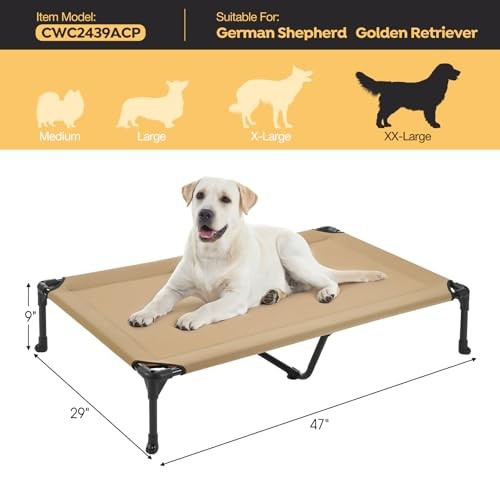30 Days Return Policy Fast Delivery Trusted seller Cooling Elevated Dog Bed, Durable Raised Pet Bed with Washable & Breathable Sandwich Mesh, No-Slip Feet, Outdoor Dog Bed, Portable Dog Cots Bed for Indoor & Outdoor, 47" x 29", Brown, CWC2439A Product Description Raised Dog Bed: Made from sandwich mesh and powder-coated steel, measuring 47"L x 29"W x 9"Th, suitable for pets up to 47 inches (120 cm) in length. Ideal for Golden Retriever, Labrador, Rottweilers, Boxers, Huskies, Doberman, Wolf dog etc. Cooling Elevated Dog Bed: The mesh fabric center allows air to circulate, keeping your pet cool especially on hot days. The sandwich mesh features a sponge layer for added softness and comfort Enhanced Comfort: An elevated dog cot offers superior comfort, cleanliness, and health benefits compared to the ground. It keeps your pet cool in summer and warm in winter Easy Assembly: No screws or wrenches required. Simply plug in to assemble. Our dog bed is lightweight and portable, ideal for indoor and outdoor use, picnics, camping, and training. Enjoy quality sleep anyw! Secure and Stable: Featuring a powder-coated steel frame, durable sandwich fabric, and non-skid rubber feet, this pet bed offers exceptional stability and high load-bearing capacity, ensuring peace of mind against collapse Shipping Returns Payment Shipping Shipping is FREE to all addresses other than APO/PO boxes in the lower 48 states. All our stock ships from US-based warehouses. Shipped via USPS or UPS (depending on location and package weight) Unless stated otherwise, all orders will ship within 24-72 hours of your payment being processed. Check our feedback to see the great reviews of FAST shipping we offer. Returns As our valued customer, we will do our best to make sure the product you receive arrives to you on time and as expected. If you are not satisfied with your purchase, please contact us within 30 days of receiving your order to process a return. Payment We currently accept payment via eBay managed payments only. Once payment is cleared, we will dispatch your shipment within 1-3 business days. Please refer to the "Shipping" tab for more information regarding shipping speed to your destination.